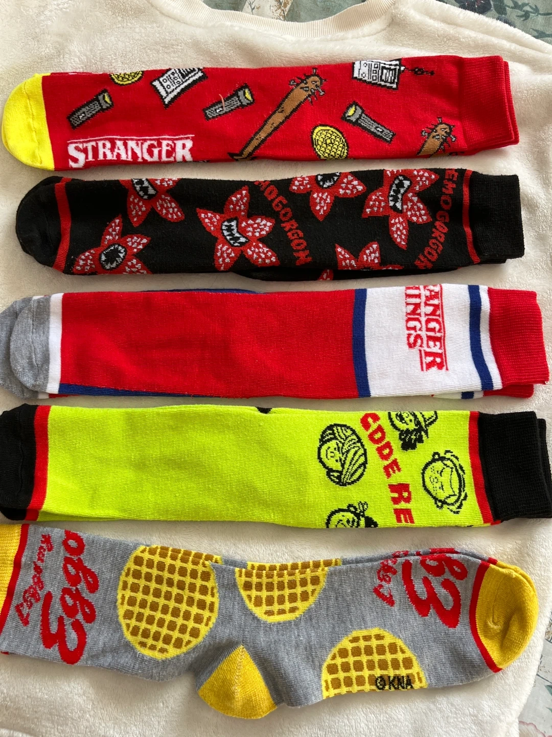 Selling a set of 5 NEW pairs of Stranger Things themed socks! Each pair has a unique design inspired by the show. Perfect for any fan! $15 set set of 5 CASH only please