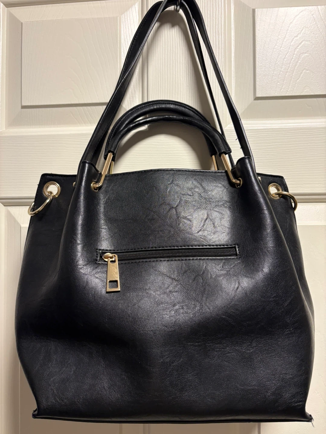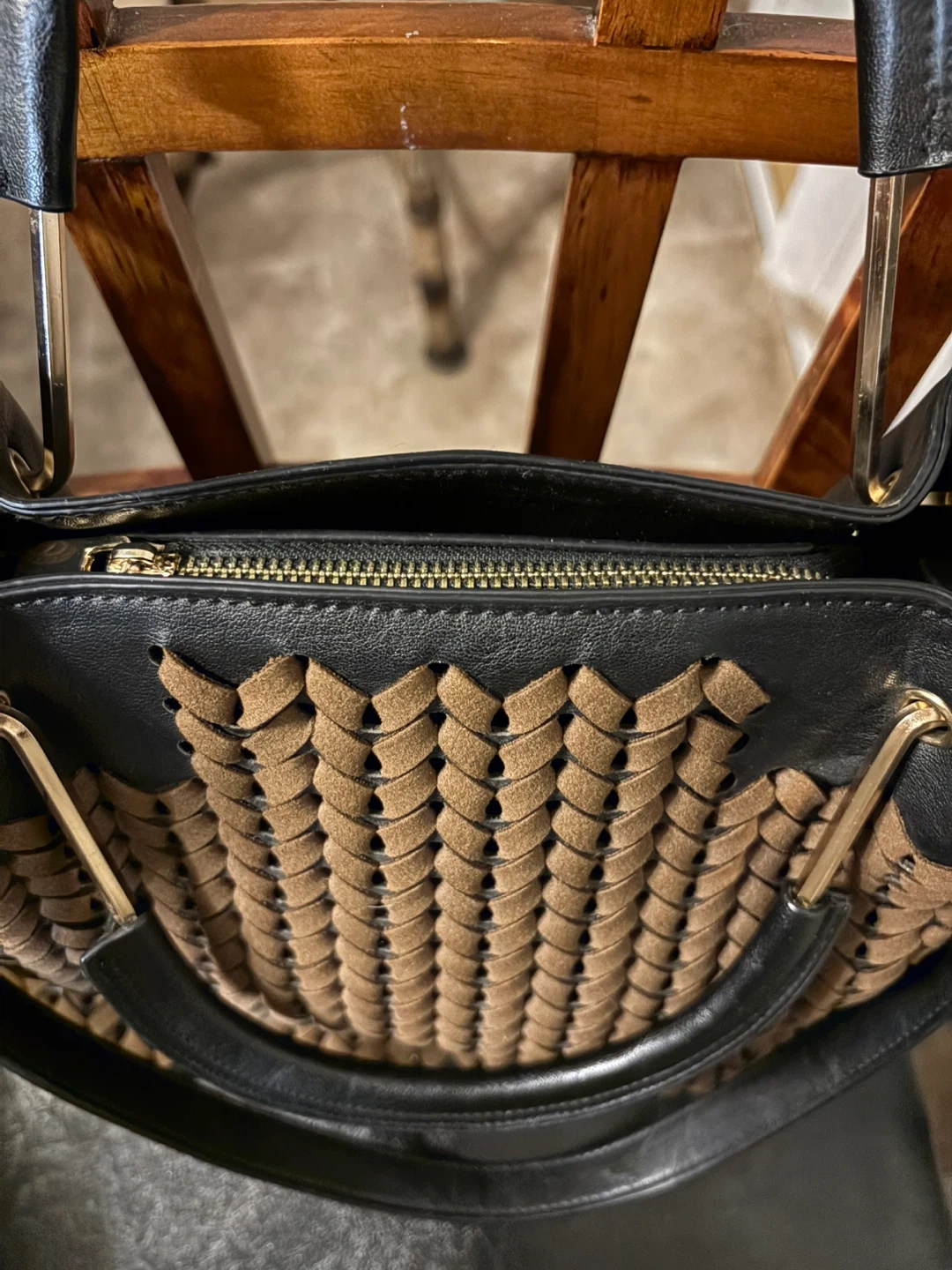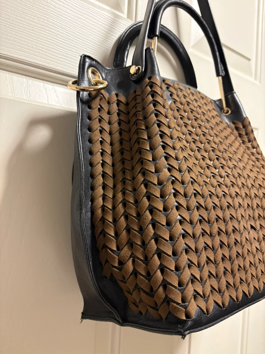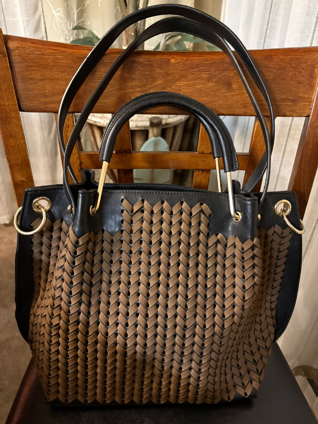 Stylish hobo handbag by Sondra Roberts, featuring a black vegan leather base and a brown woven front panel. It features top handles and a zippered pocket on the back. This bag offers a chic look for everyday use. Great condition, just like new! Pick up in Chestermere.