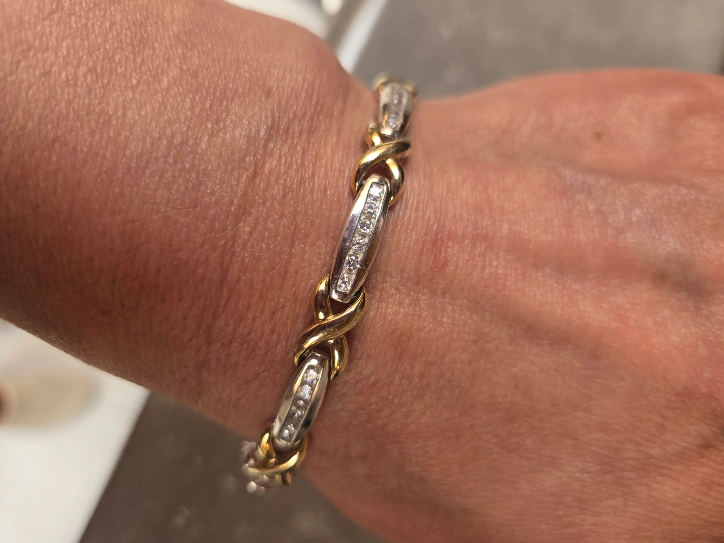 Beautiful bracelet, two-tone sterling silver with gold accents features channel-set cubics, clasp closure. Looks great on the wrist.