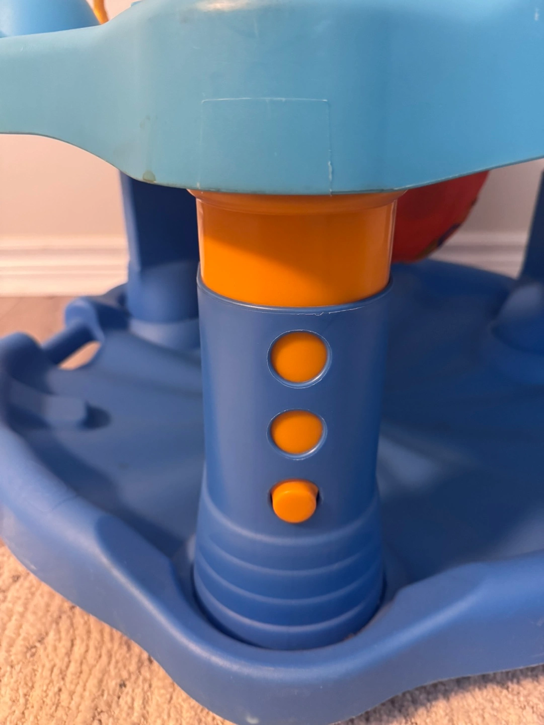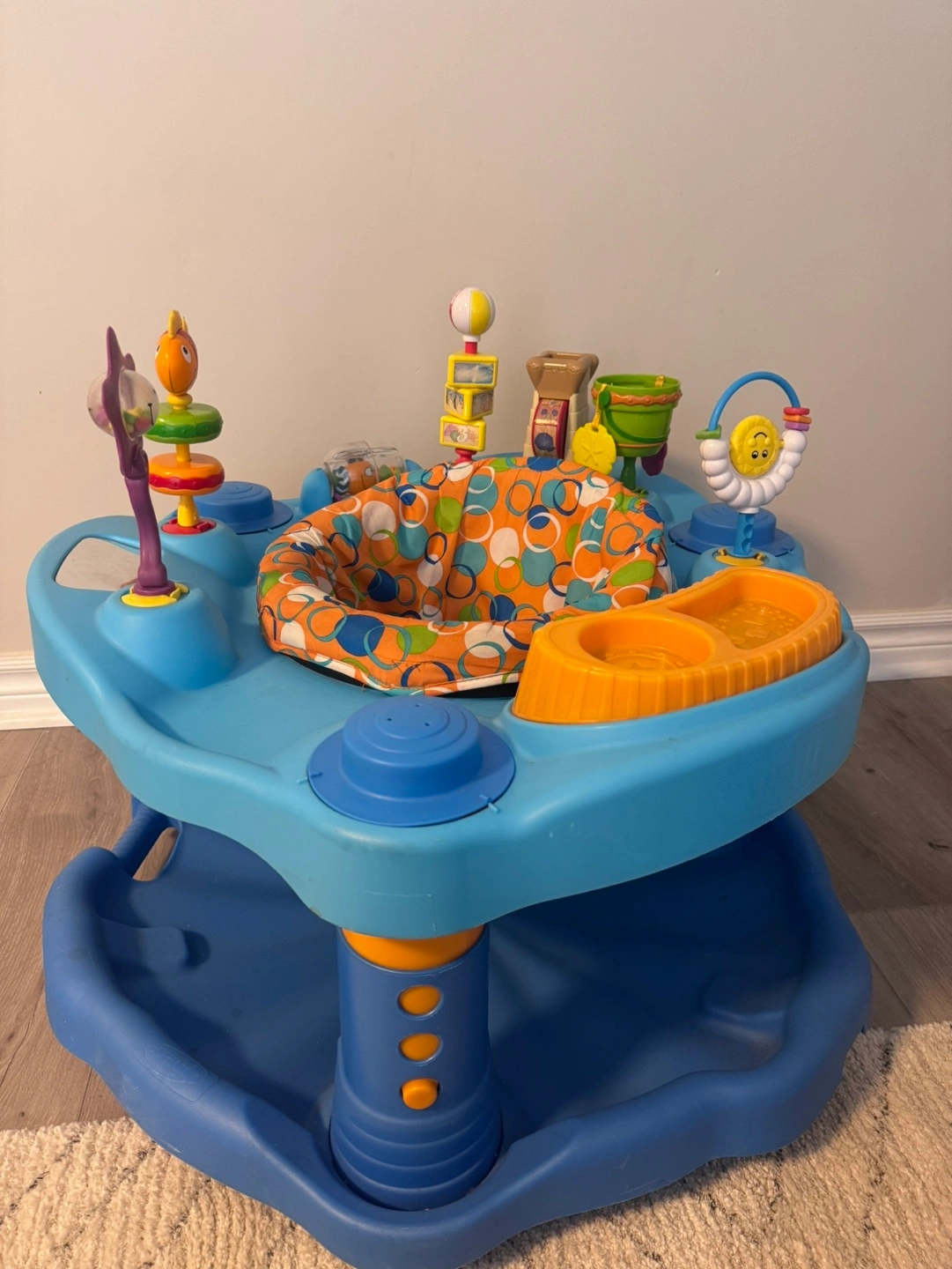 Fun and engaging baby activity centre. Features multiple toys and activities. Great for stimulating development. Blue and orange colour scheme. Good used condition.