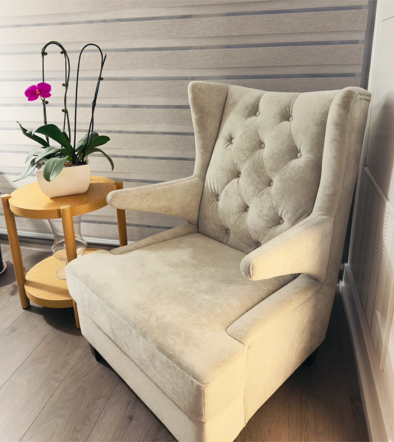 This cream-coloured wingback accent chair features a tufted backrest and plush upholstery. It's a comfortable addition to any living space. The chair's classic design makes it suitable for various decor styles.
