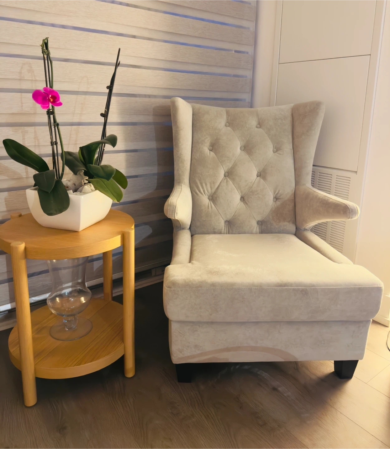 This cream-coloured wingback accent chair features a tufted backrest and plush upholstery. It's a comfortable addition to any living space. The chair's classic design makes it suitable for various decor styles.