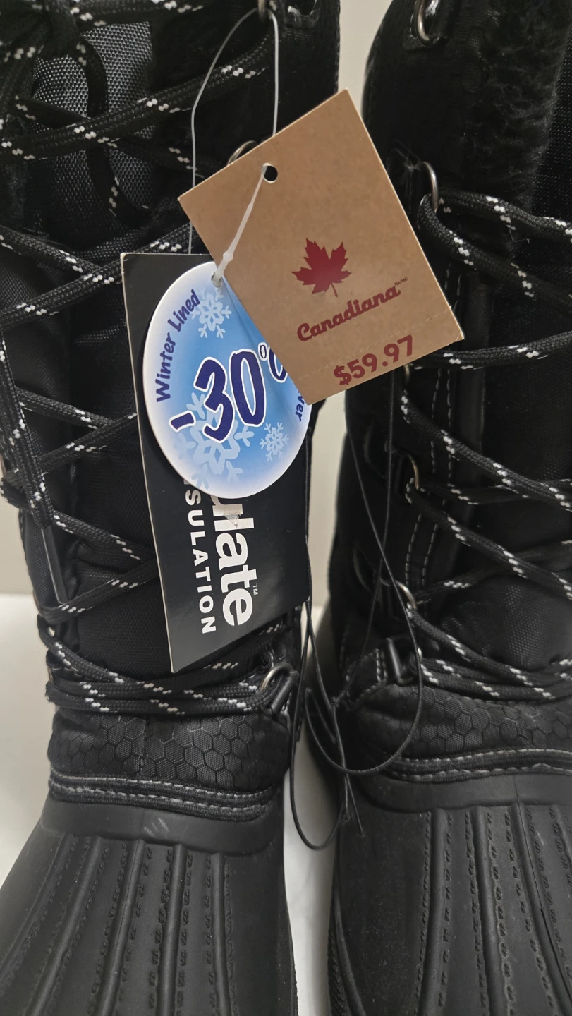 These are brand new Canadiana winter boots from Canadian Tire! They're black and feature 3M Thinsulate insulation to keep your feet warm and cozy during the cold winter months. Originally priced at $59.97.