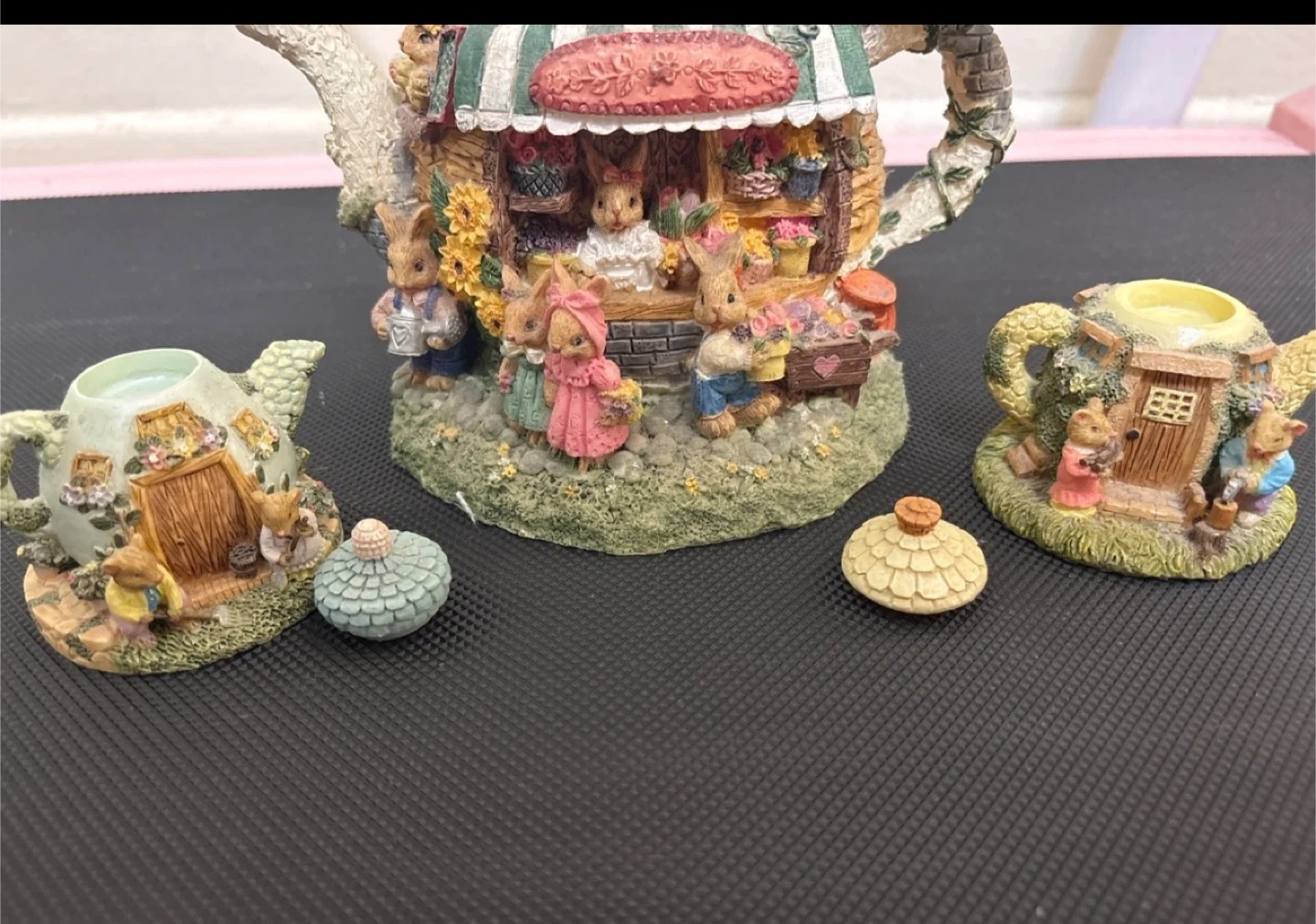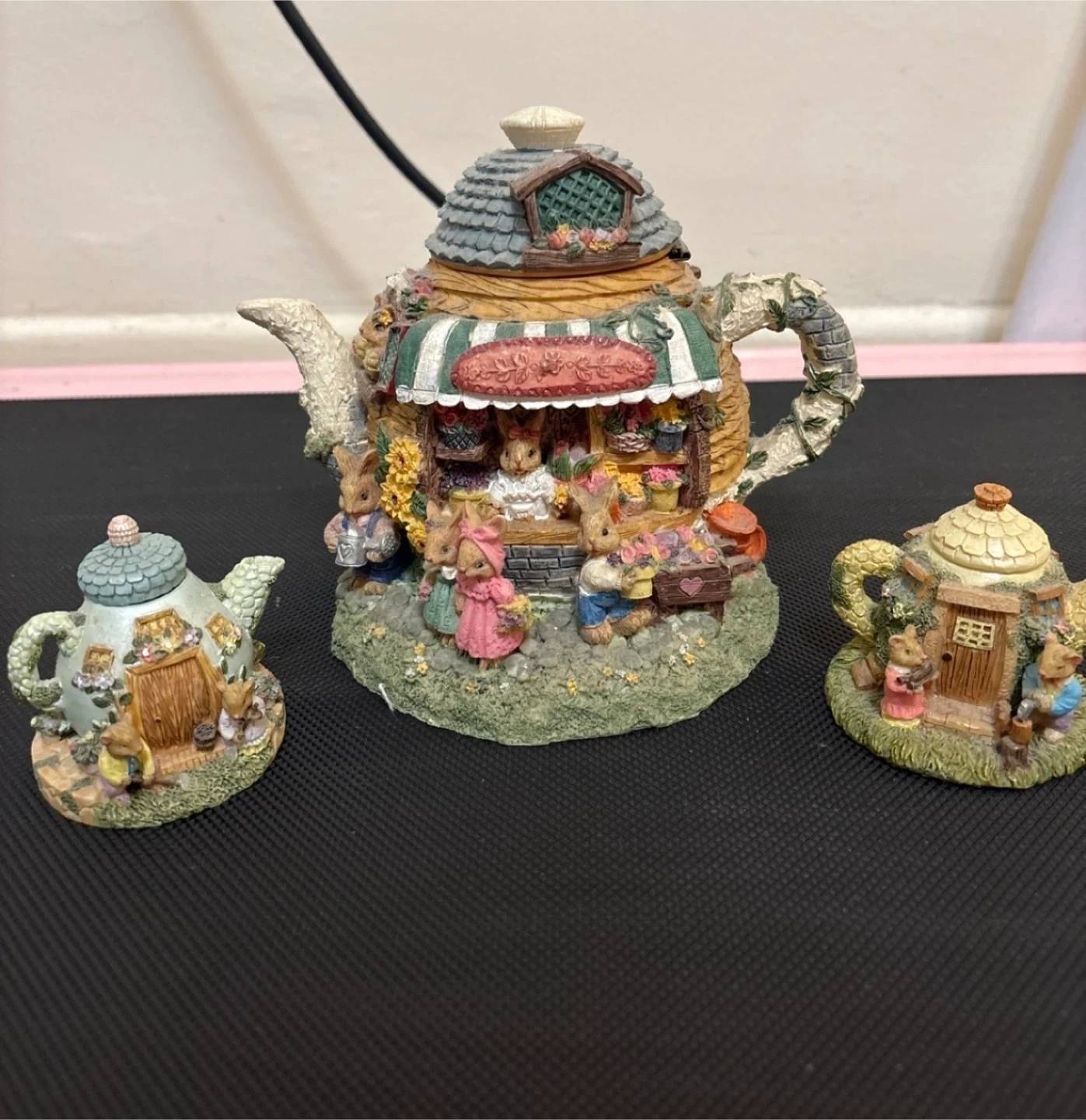 This charming set includes three decorative teapots. The centrepiece is a larger teapot depicting a bunny flower shop scene. Two smaller teapots are also included, each with unique bunny house designs. They're great for display and adding a whimsical touch to your decor!