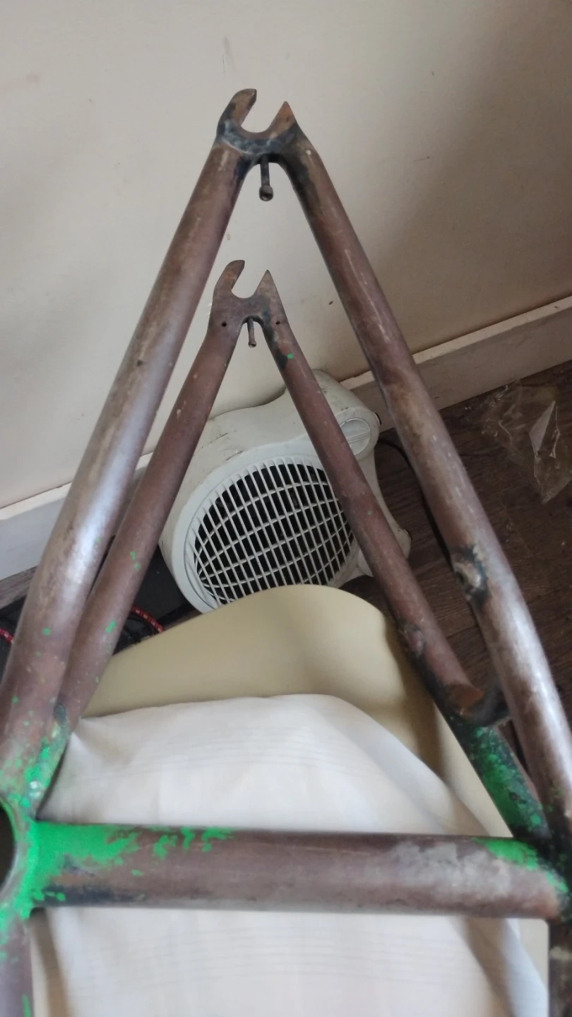 This is a vintage bicycle frame and crankset. It's made of metal and appears to be from an older model bike. The frame shows signs of age and use. It's a project piece for bike enthusiasts.