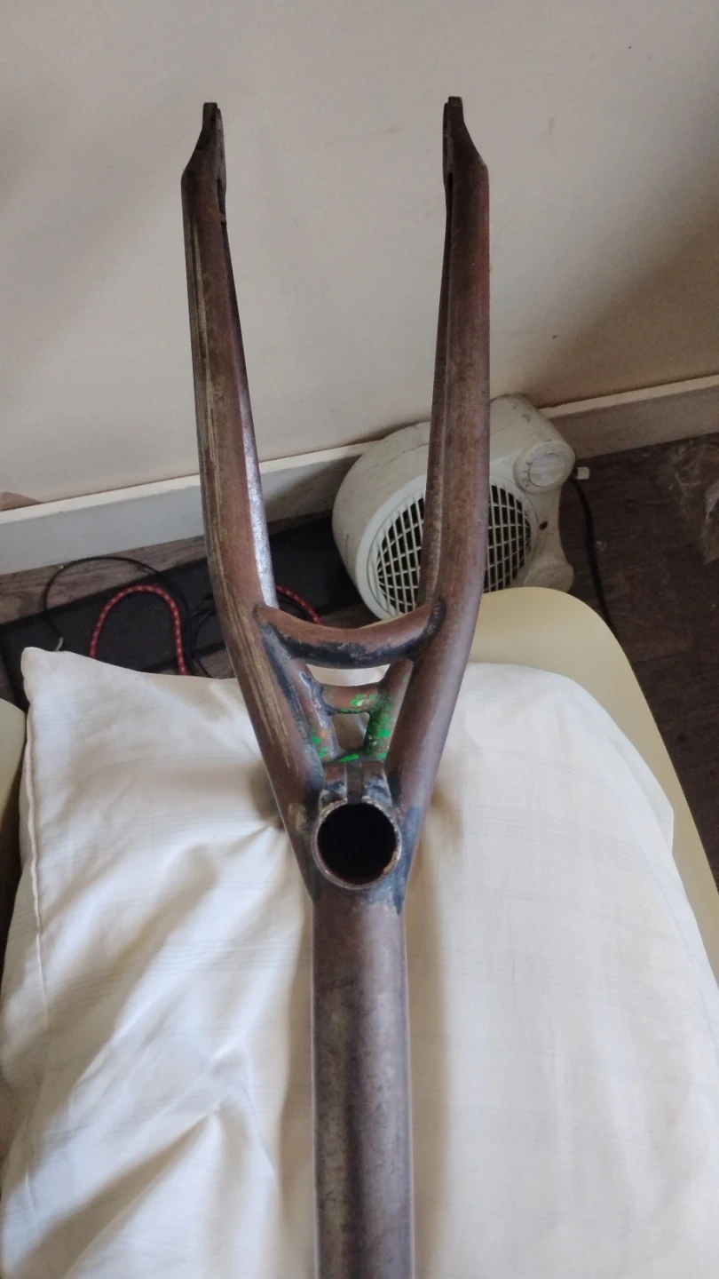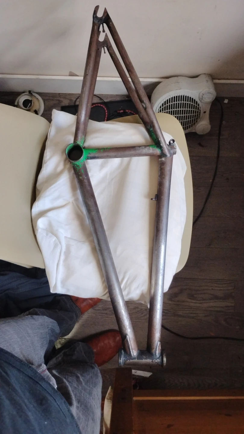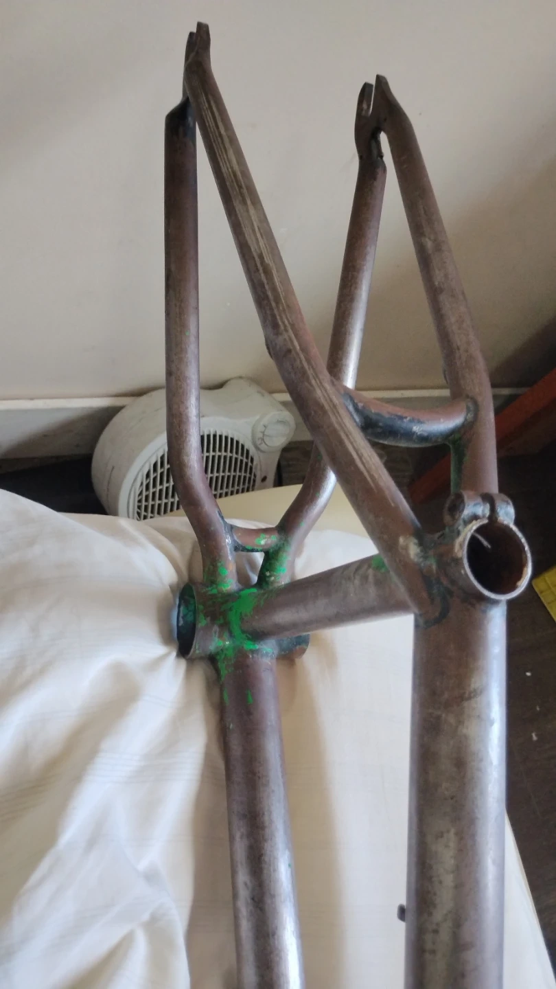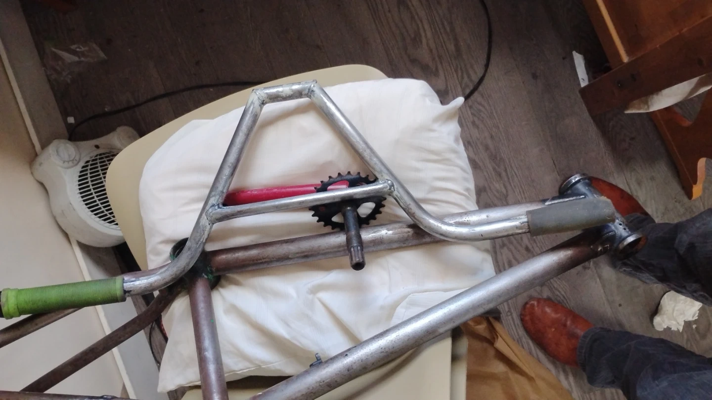 This is a vintage bicycle frame and crankset. It's made of metal and appears to be from an older model bike. The frame shows signs of age and use. It's a project piece for bike enthusiasts.