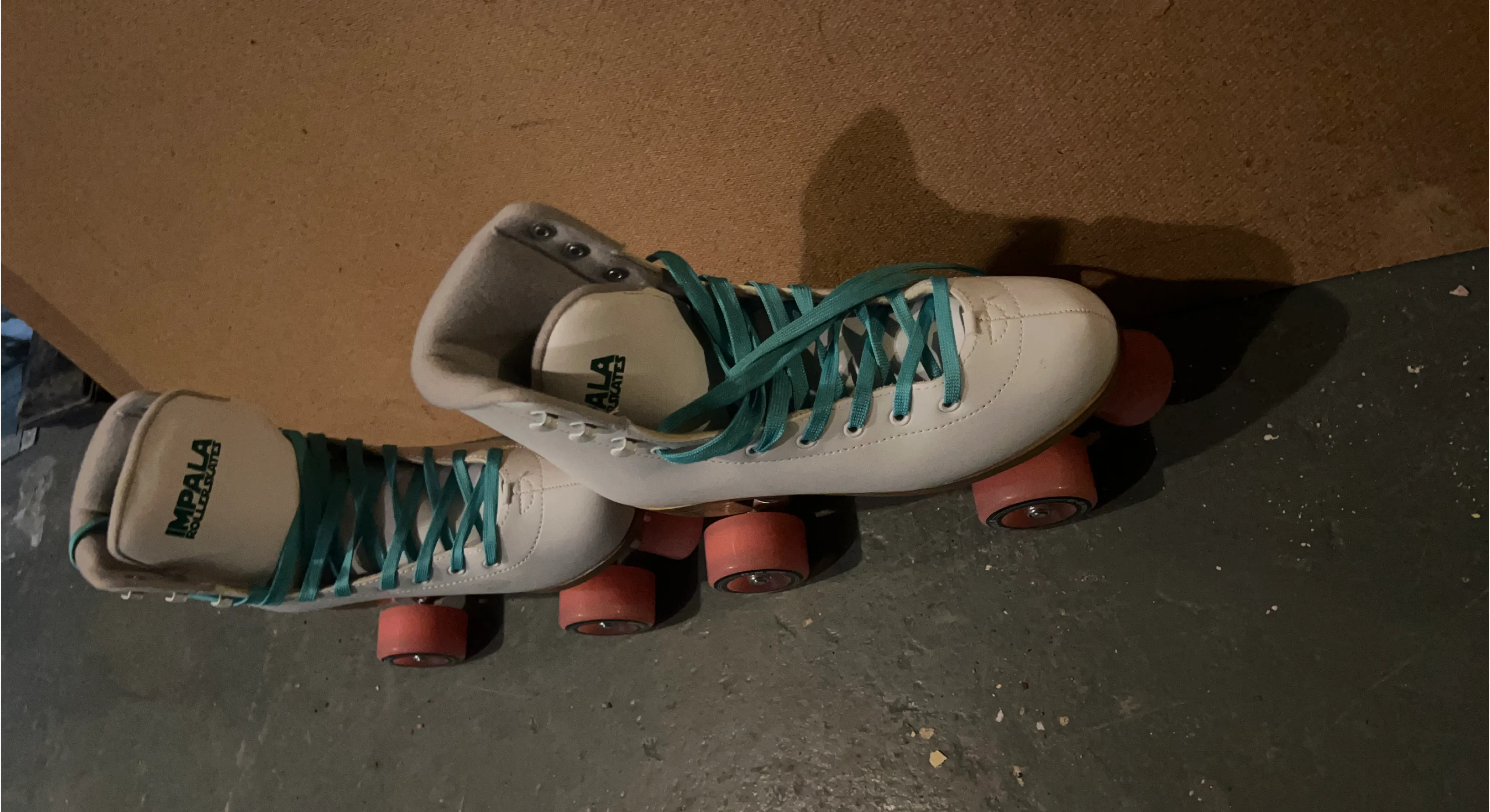 Here are some Impala roller skates! They're white with teal laces and coral wheels. Perfect for skating around town