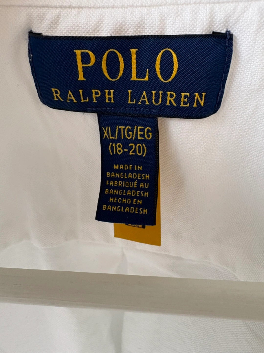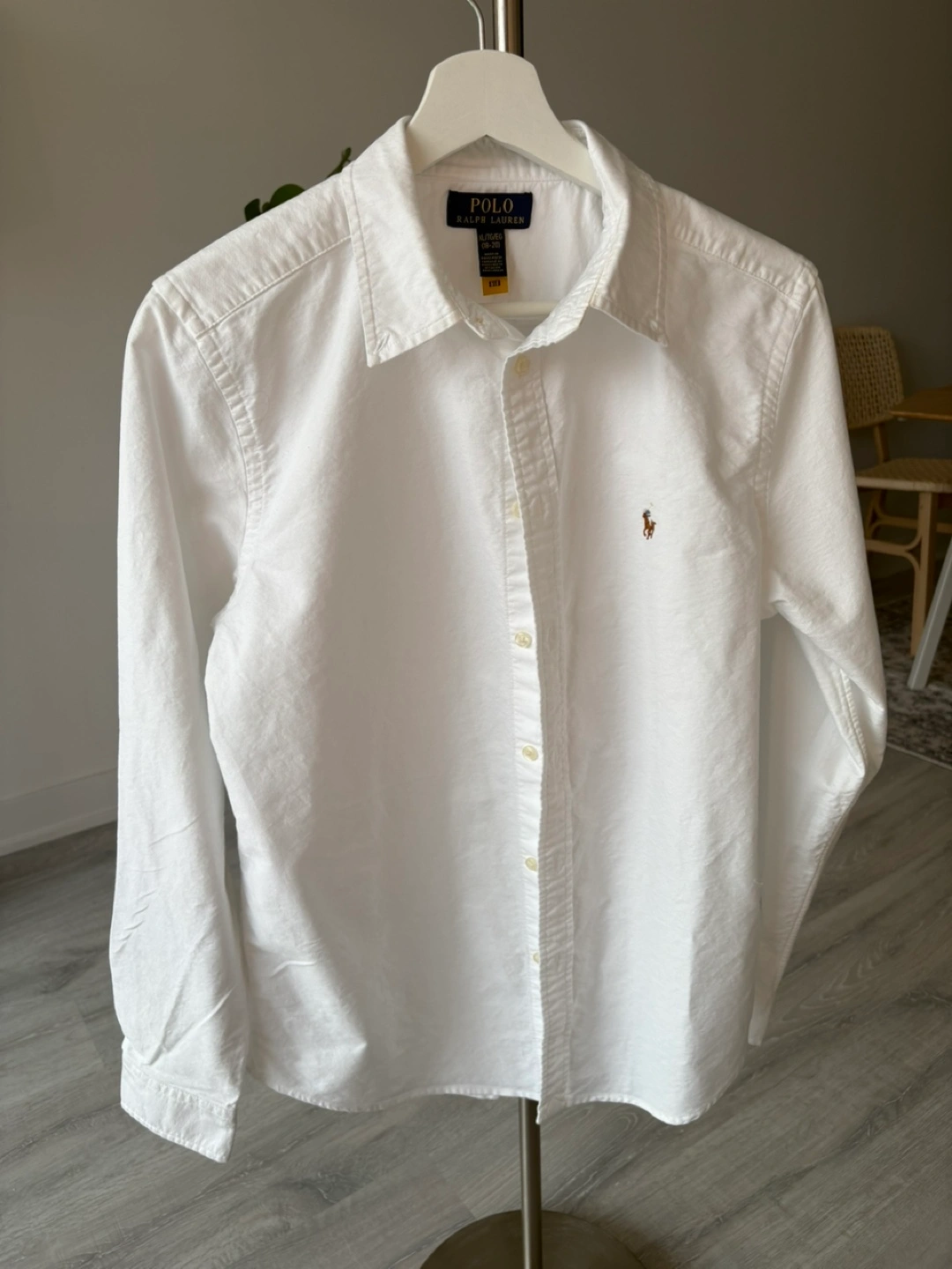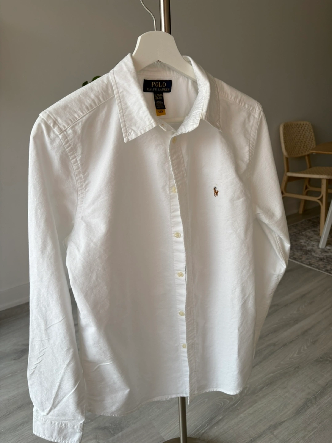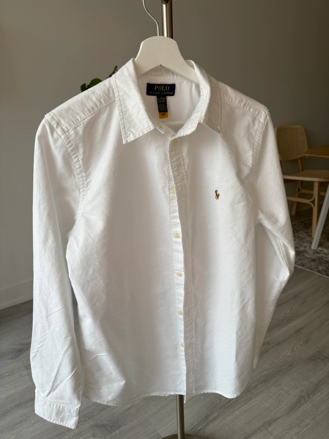 A classic white button up shirt, perfect for any occasion. It features long sleeves and a collared neckline. The Polo logo is subtly embroidered. Find comfort in its versatile style.