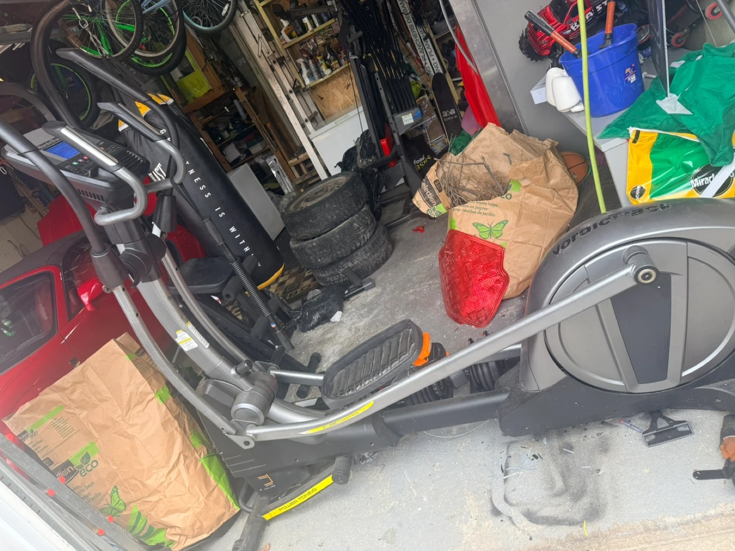 NordicTrack elliptical trainer with multiple workout programs and 22 resistance levels. It has a digital display showing time, distance, calories, and speed. This machine is good for home workouts.
