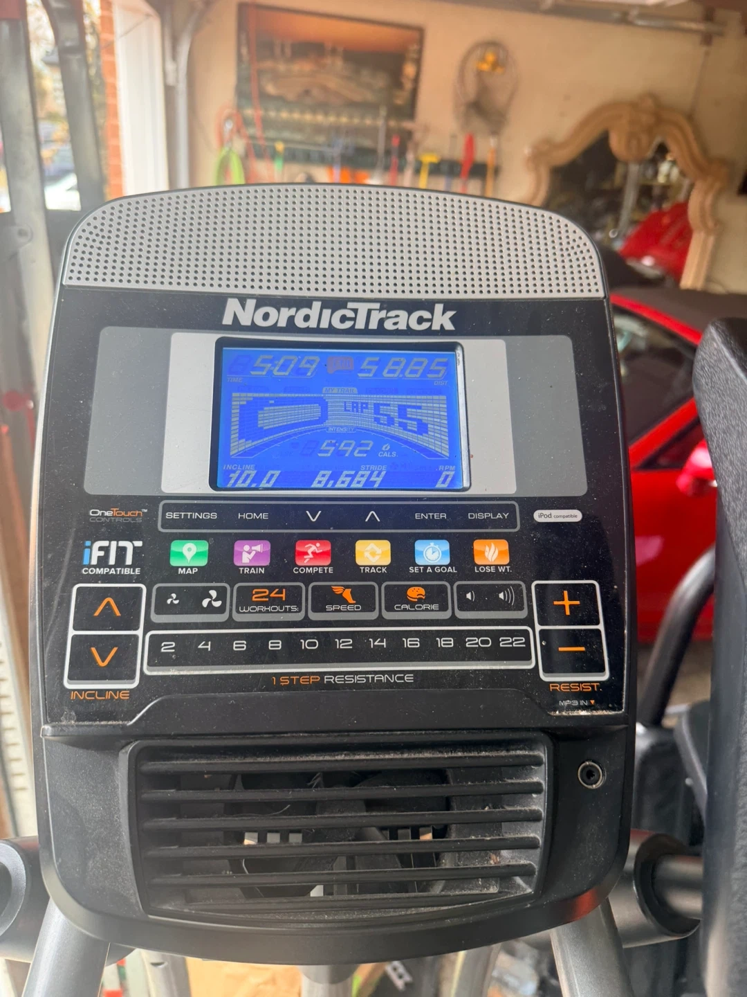 NordicTrack elliptical trainer with multiple workout programs and 22 resistance levels. It has a digital display showing time, distance, calories, and speed. This machine is good for home workouts.