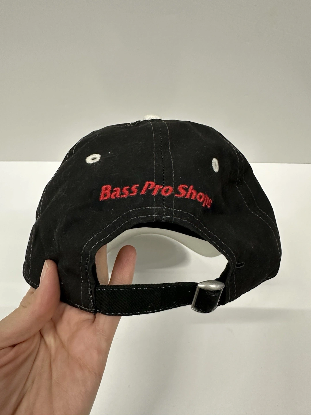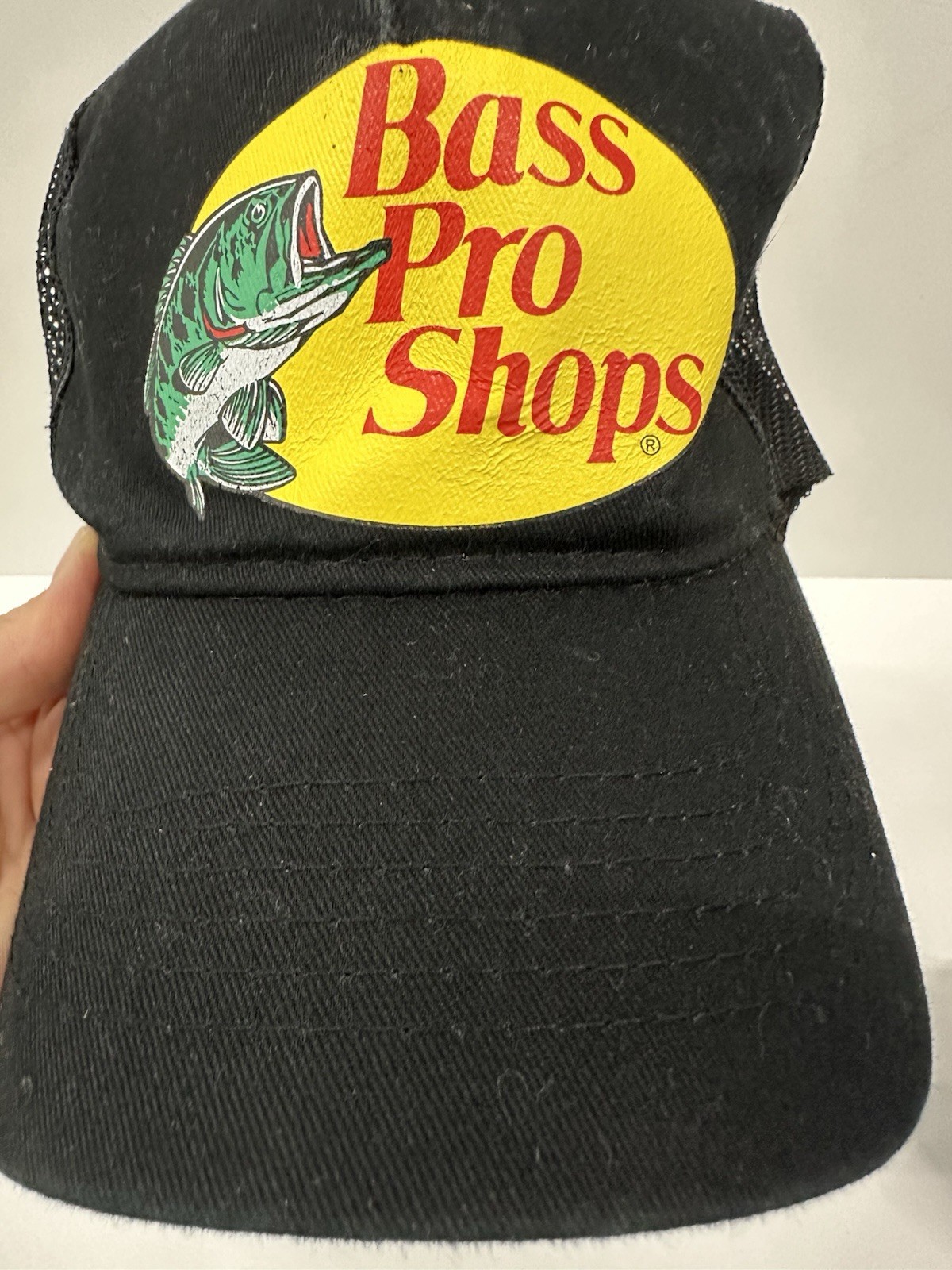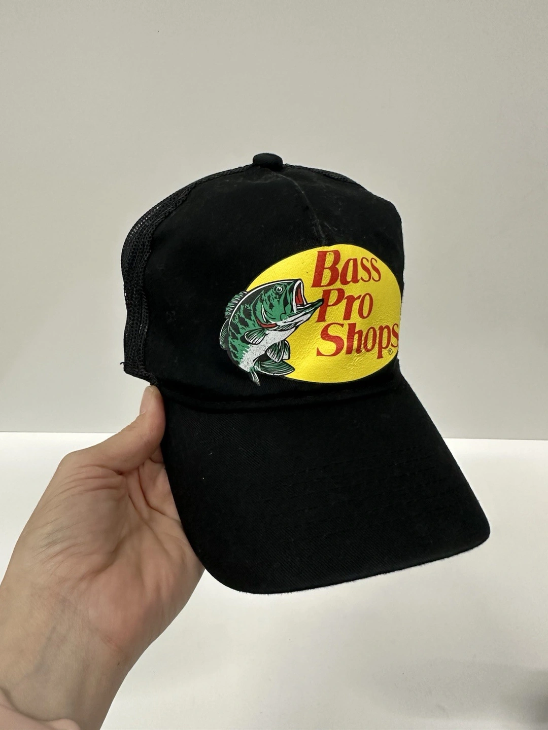 Bass Pro Shops trucker hats, men's size one size. Black color with adjustable, breathable, and lightweight mesh back. Great for casual wear, travel, or workwear during spring, summer, or fall.