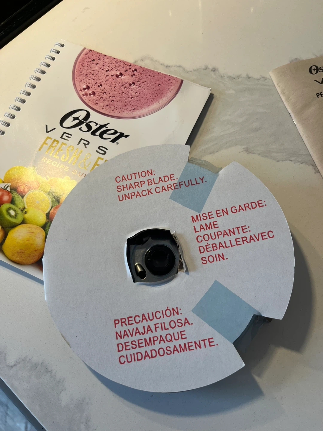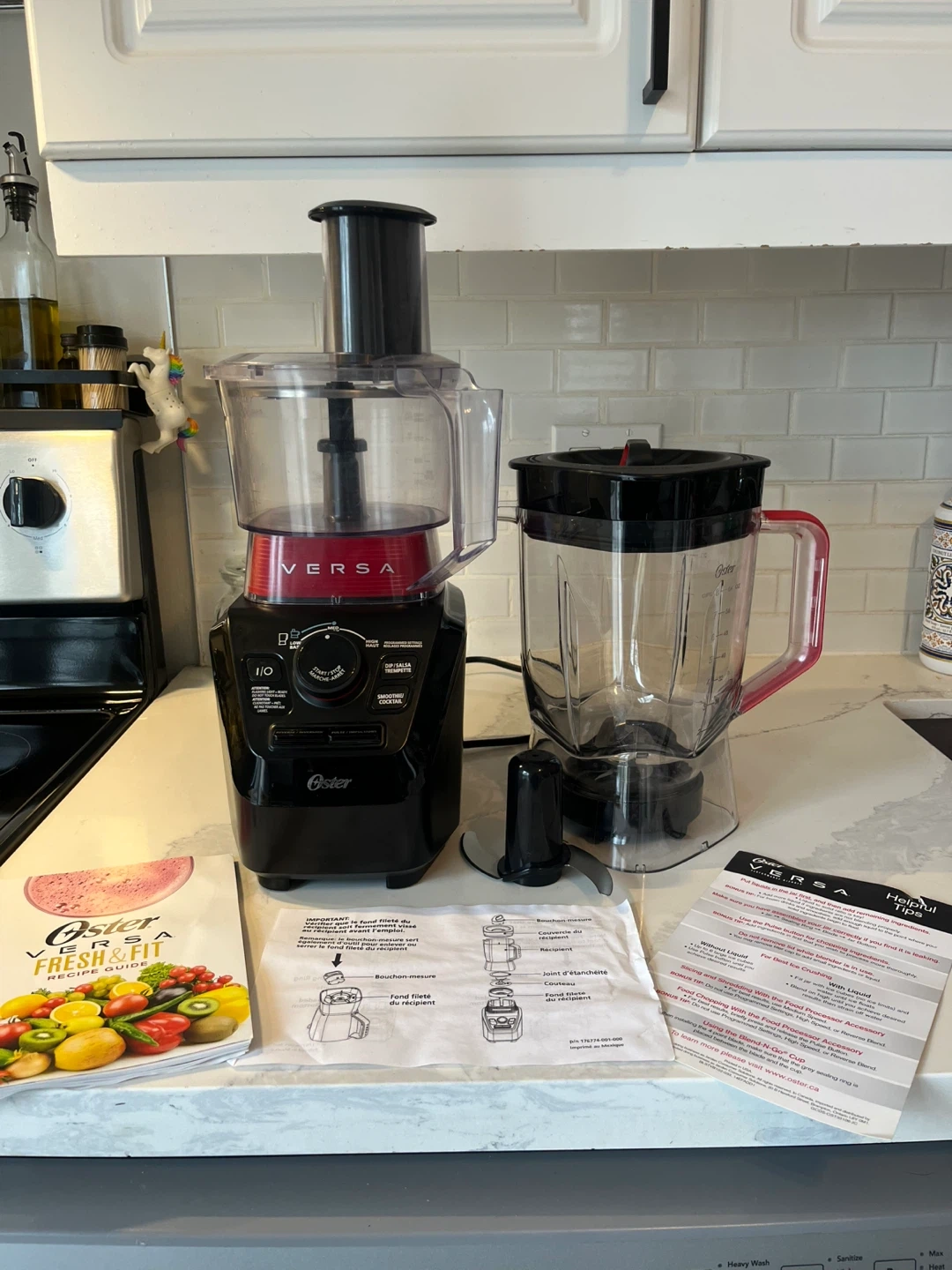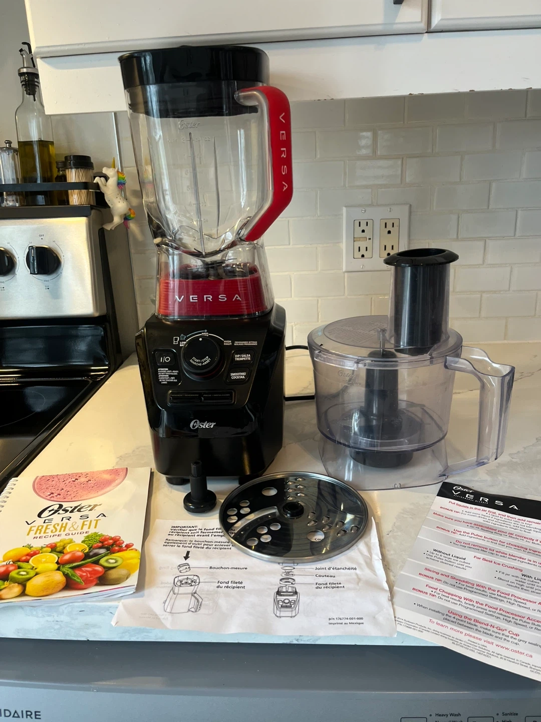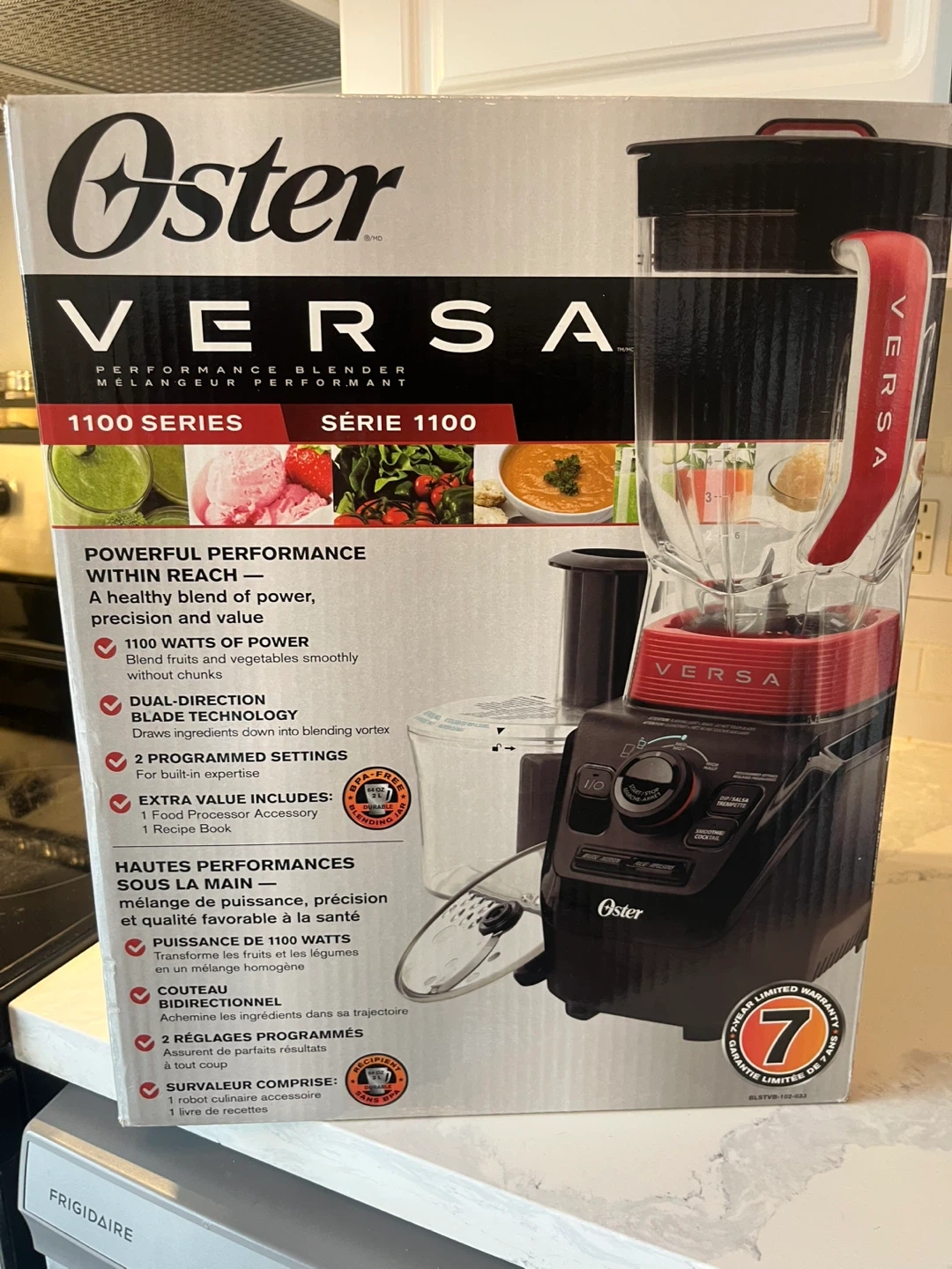 Oster Versa 1100 Series blender with a food processor attachment. It's a powerful blender with 1100 watts and dual-direction blade technology. Includes the recipe book and all original components. Great for smoothies, soups, and more!