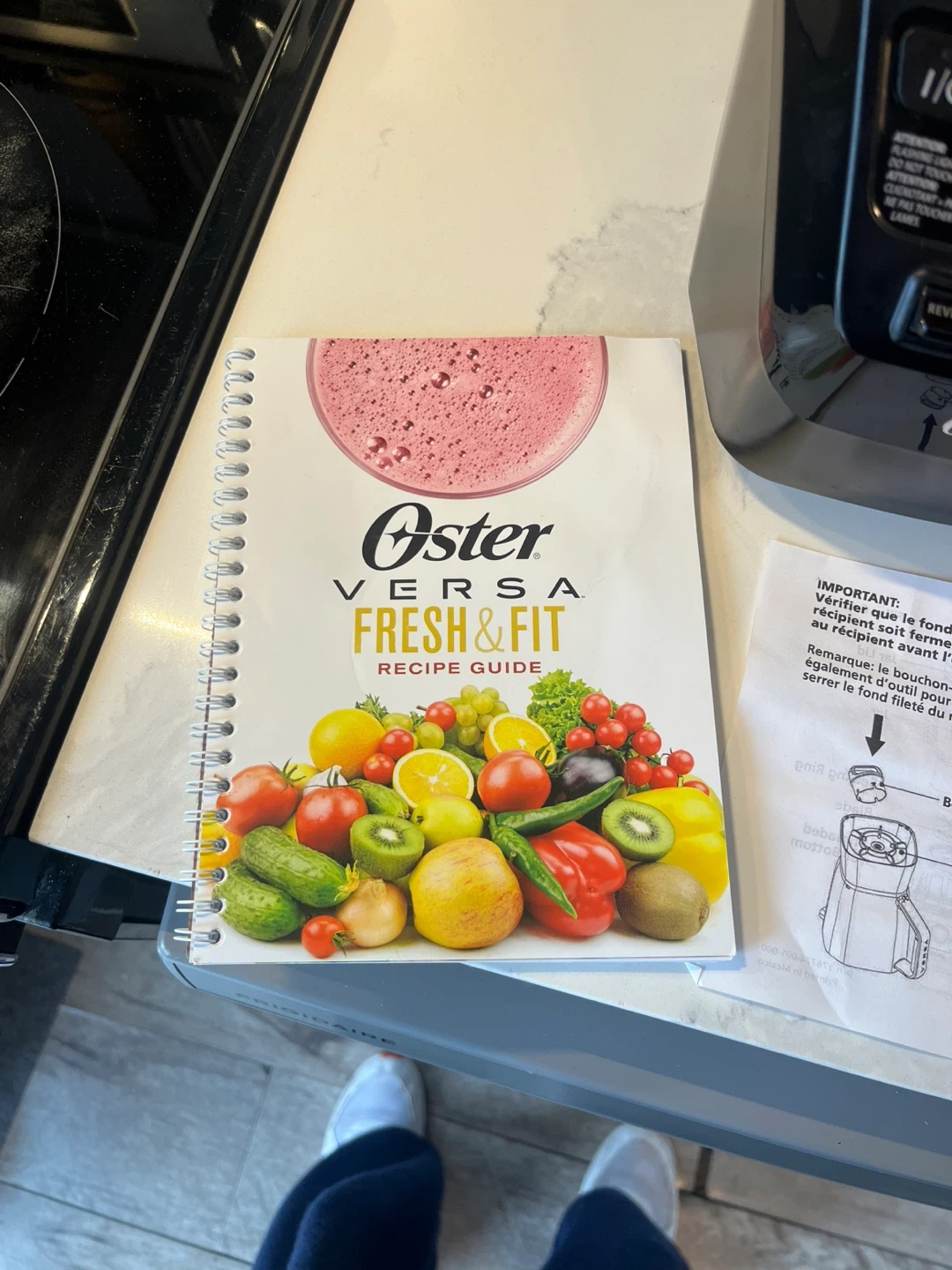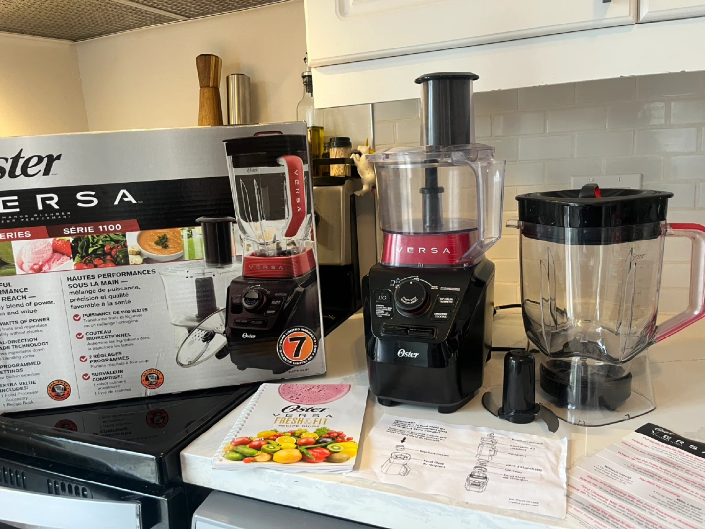 Oster Versa 1100 Series blender with a food processor attachment. It's a powerful blender with 1100 watts and dual-direction blade technology. Includes the recipe book and all original components. Great for smoothies, soups, and more!