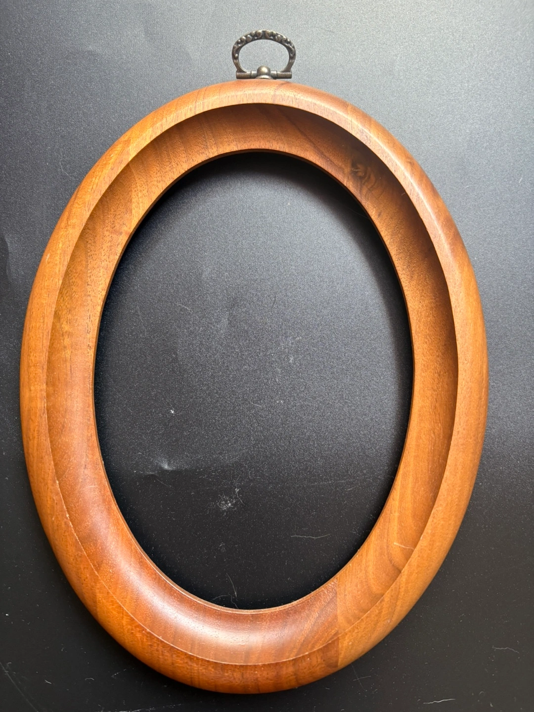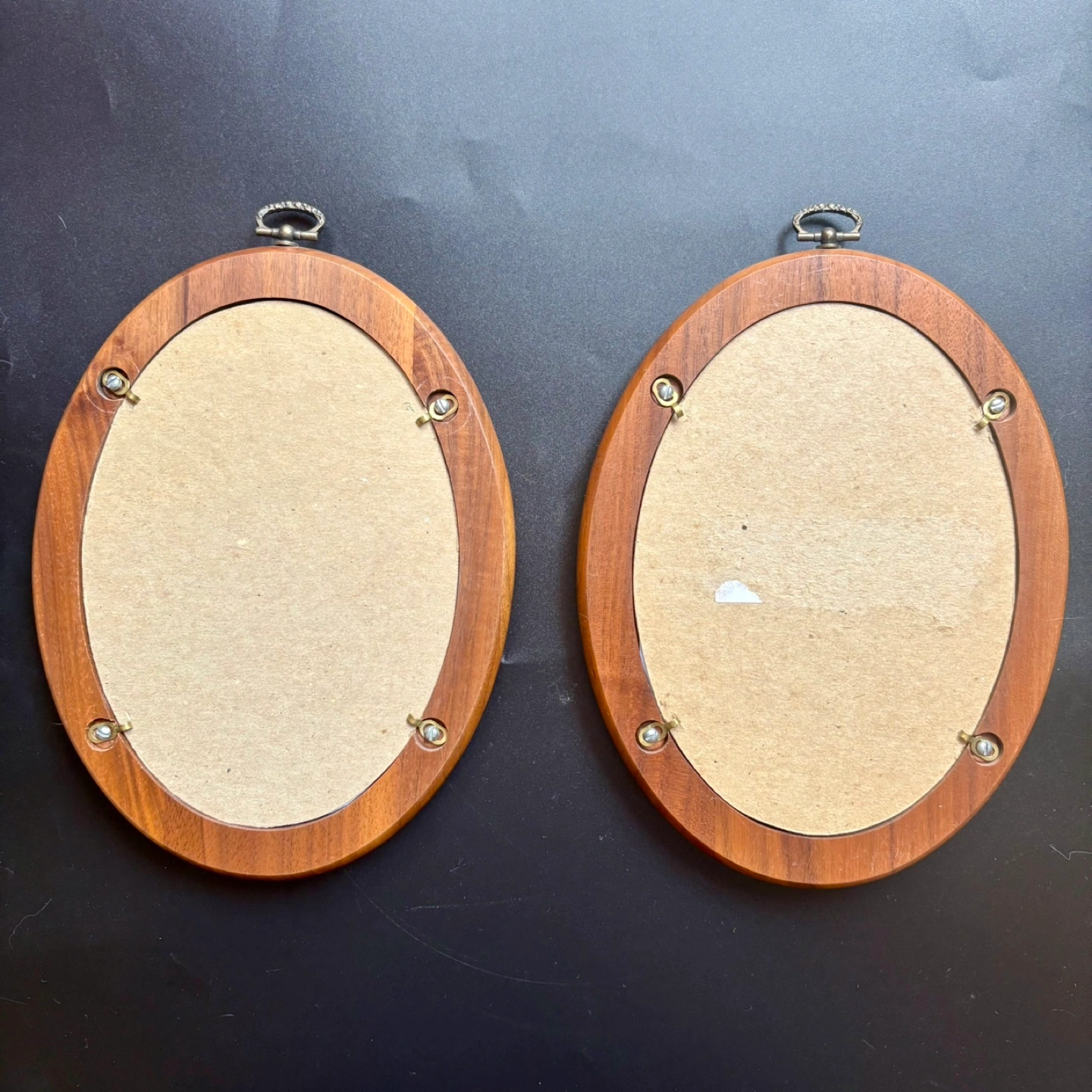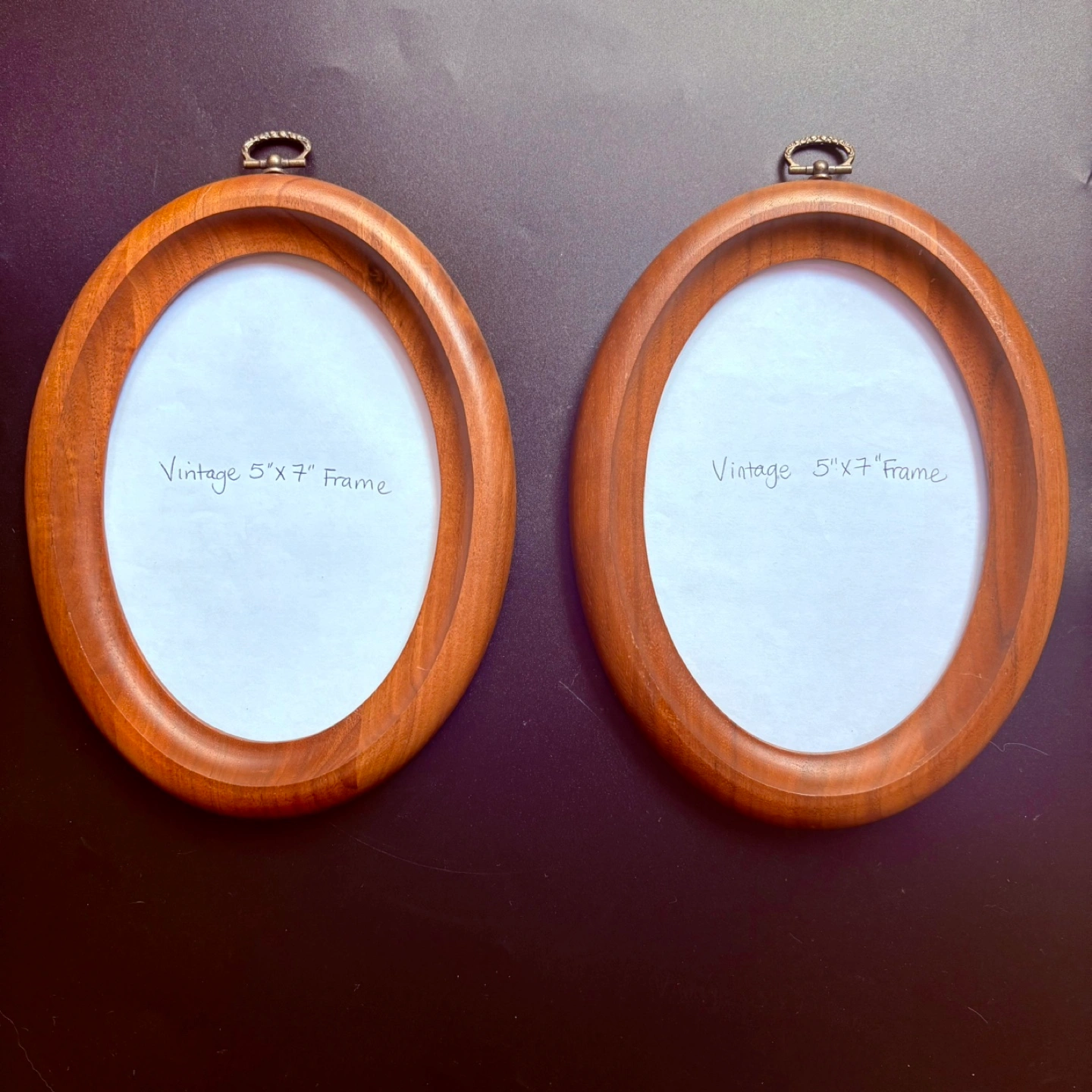 Two matching oval picture frames. Dark wood finish. Metal hanging hardware. Approximate size 5" x 7". Great for displaying photos or artwork.