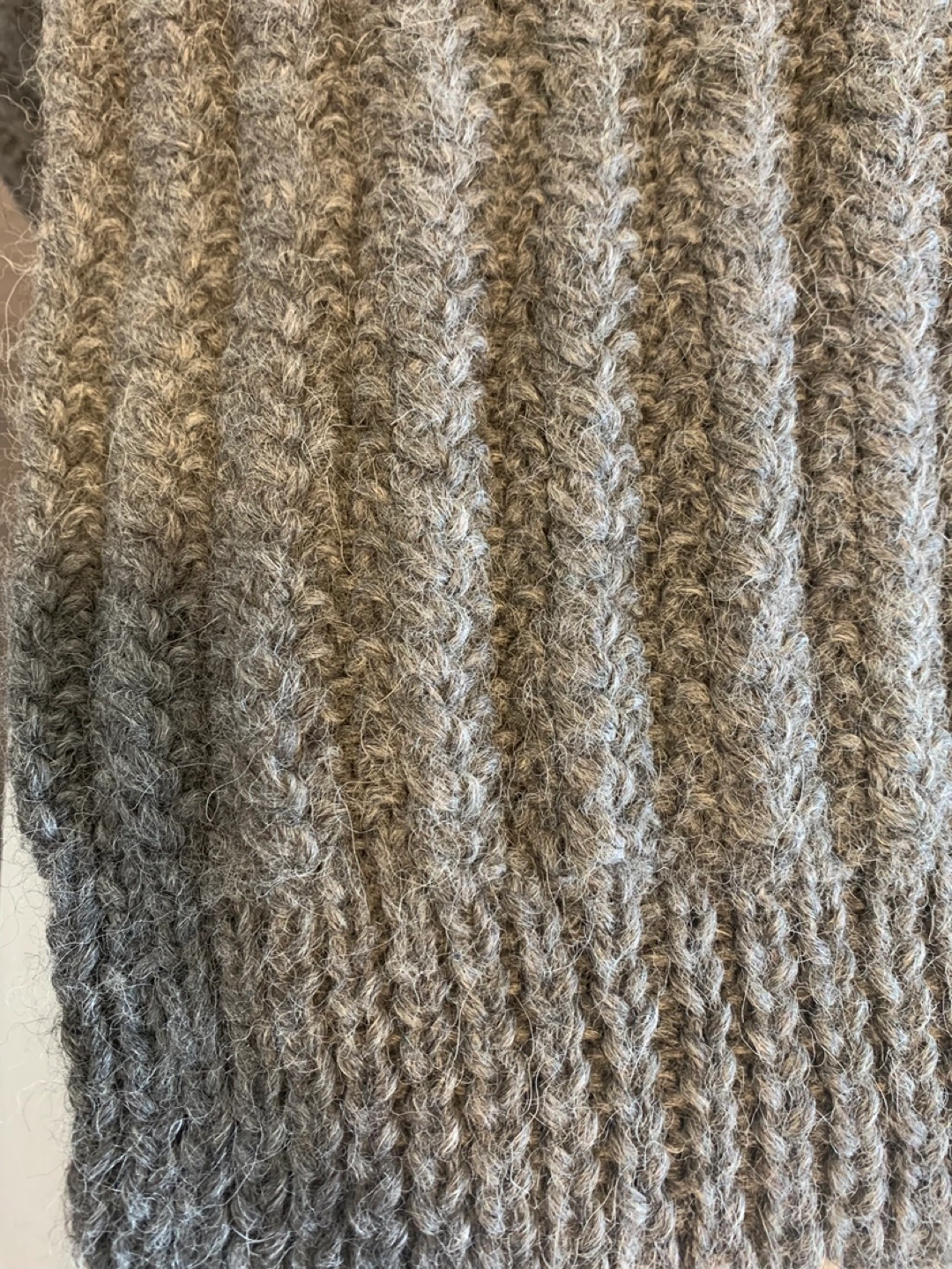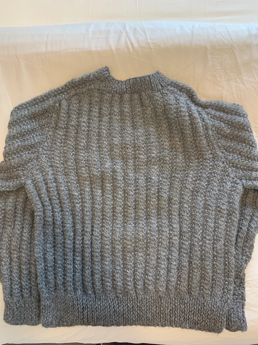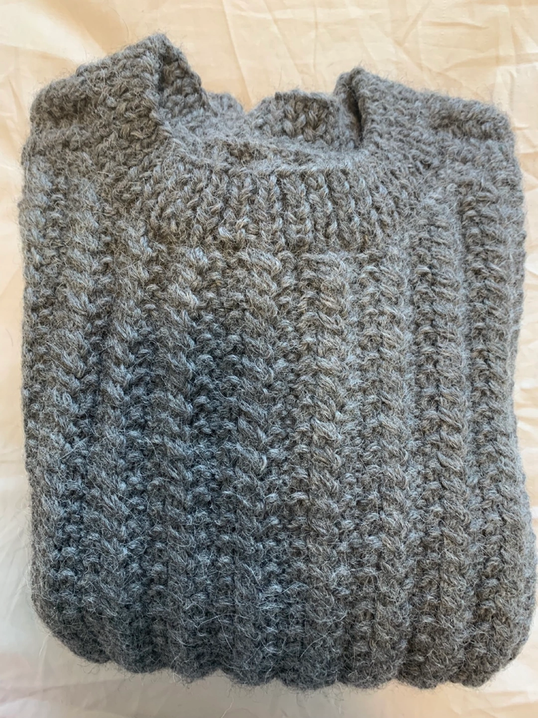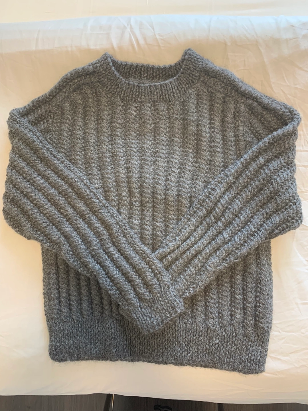 A lovely grey knit sweater. Features long sleeves and a round neckline. The knit has a textured look. Wearing this sweater would make you feel perfectly comfortable.