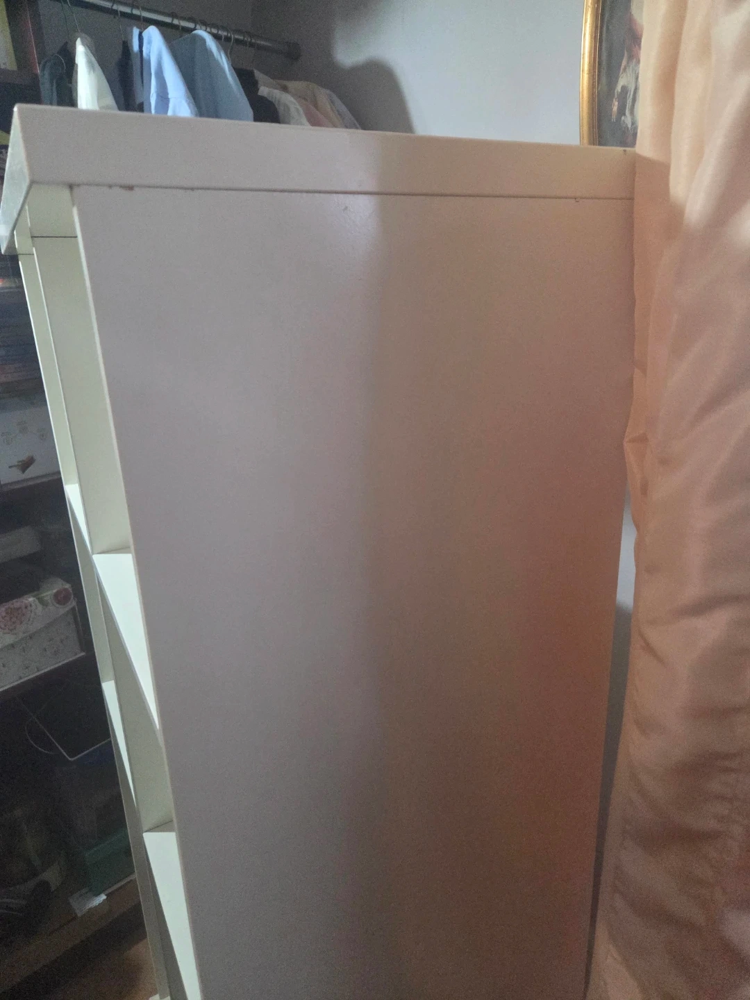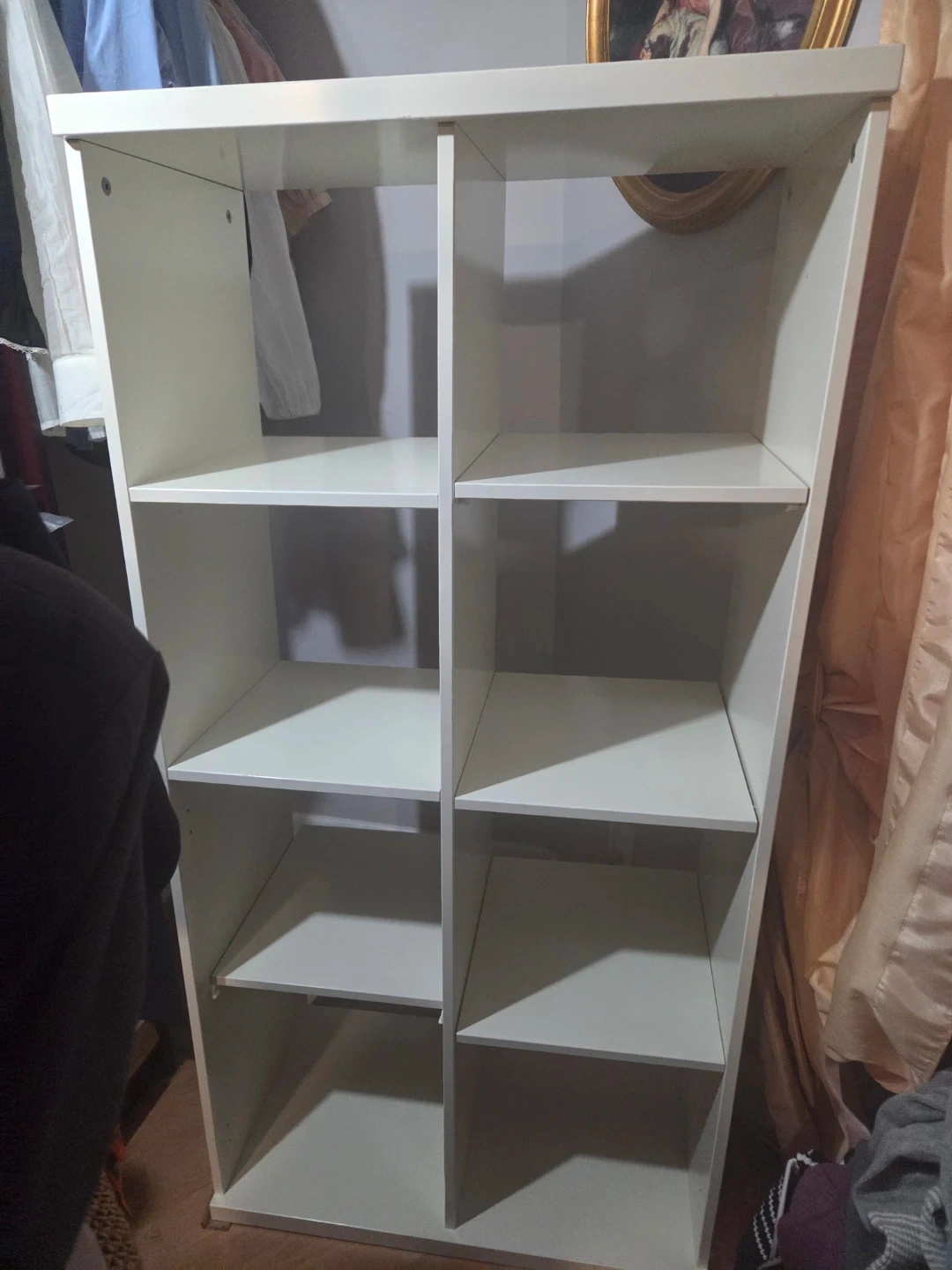 This is a white storage unit with eight cubbies. It's great for organizing books, decor, or other items. The shelves are evenly spaced for versatile storage. It measures approximately 58 inches high and 28inches wide.
