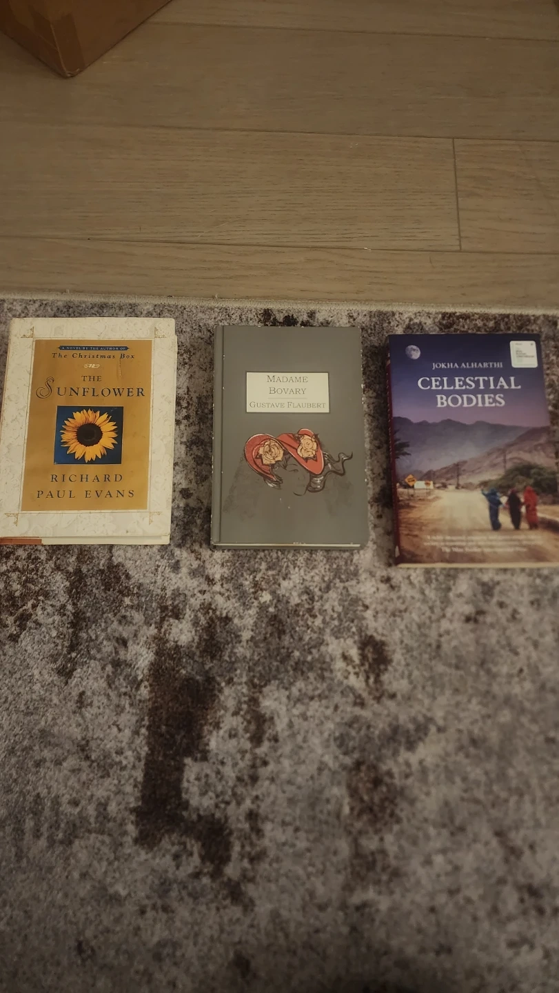 Three novels: 'The Sunflower' by Richard Paul Evans, 'Madame Bovary' by Gustave Flaubert, and 'Celestial Bodies' by Jokha Alharthi. These books are perfect for any avid reader looking to expand their collection. Selling all three for $10, or $4 each