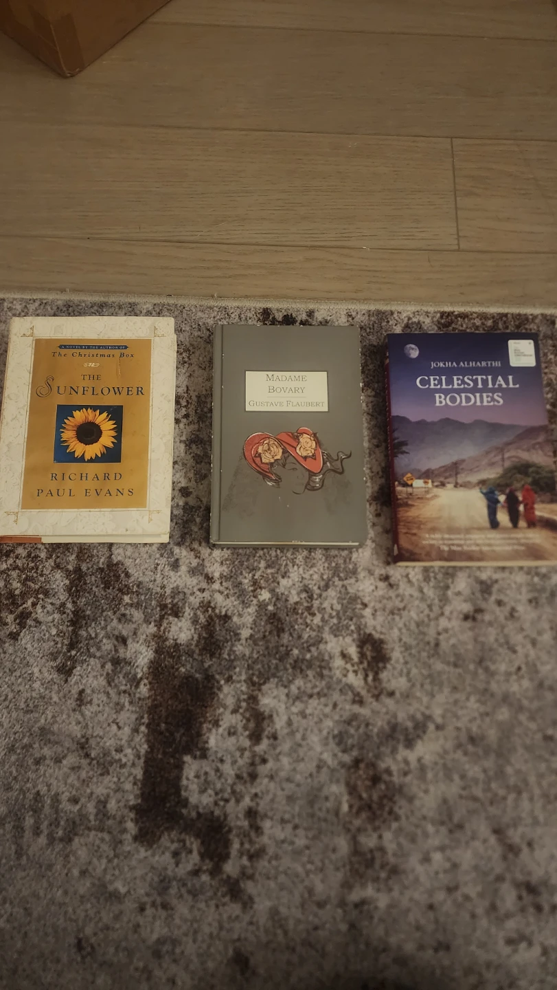 Three novels: 'The Sunflower' by Richard Paul Evans, 'Madame Bovary' by Gustave Flaubert, and 'Celestial Bodies' by Jokha Alharthi. These books are perfect for any avid reader looking to expand their collection. Selling all three for $10, or $4 each