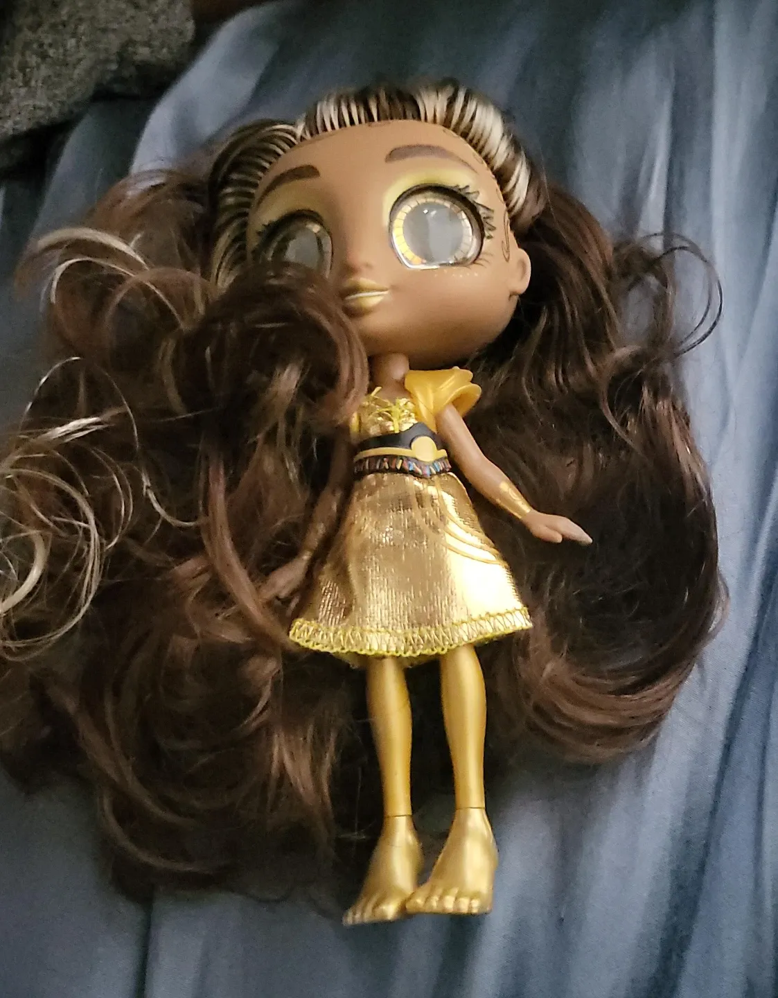 This doll has long, wavy brown hair with blonde streaks. She's wearing a shiny gold dress with a black and gold banded waist. Her eyes are large and detailed, and she has gold-coloured legs and feet.