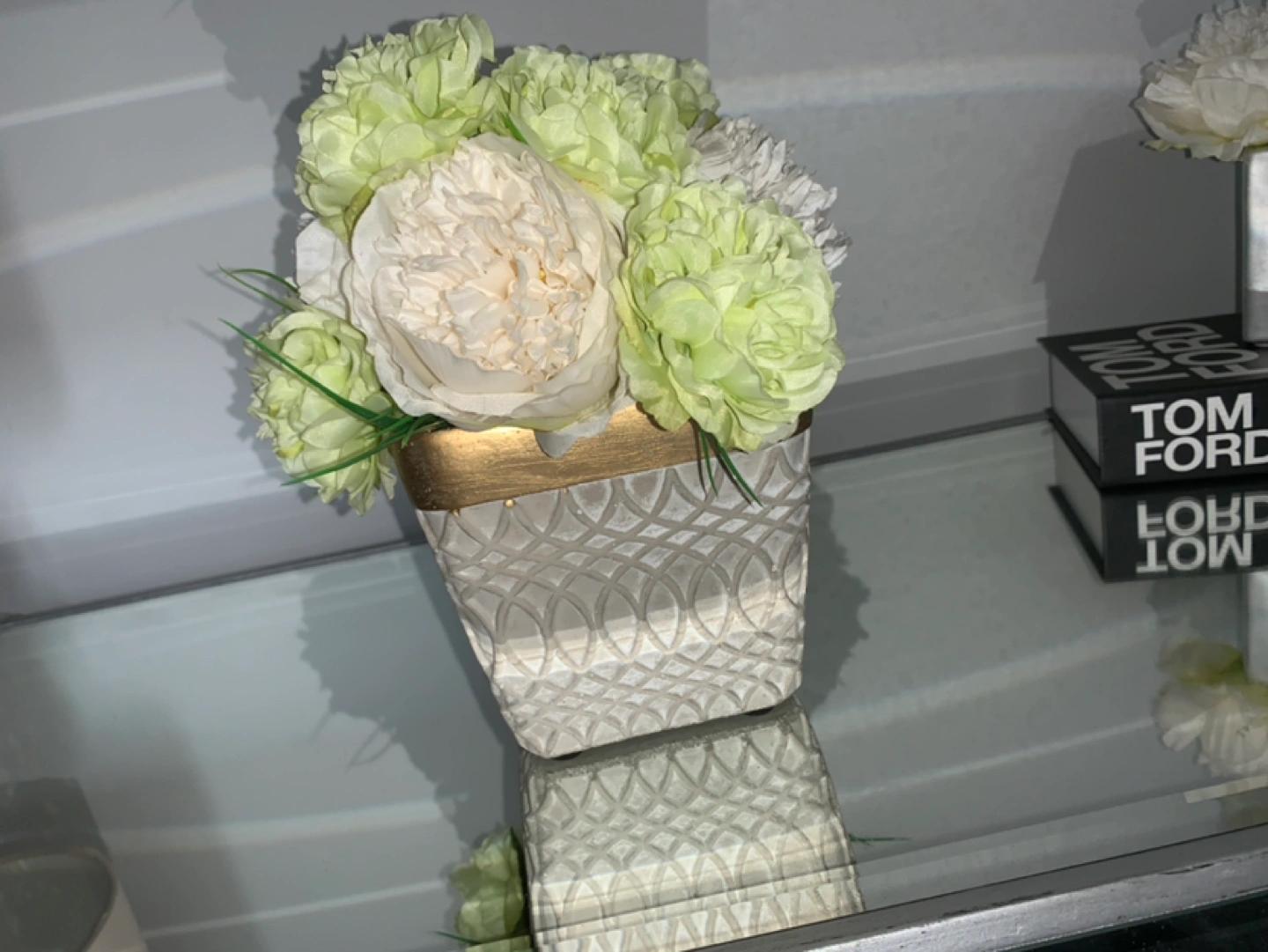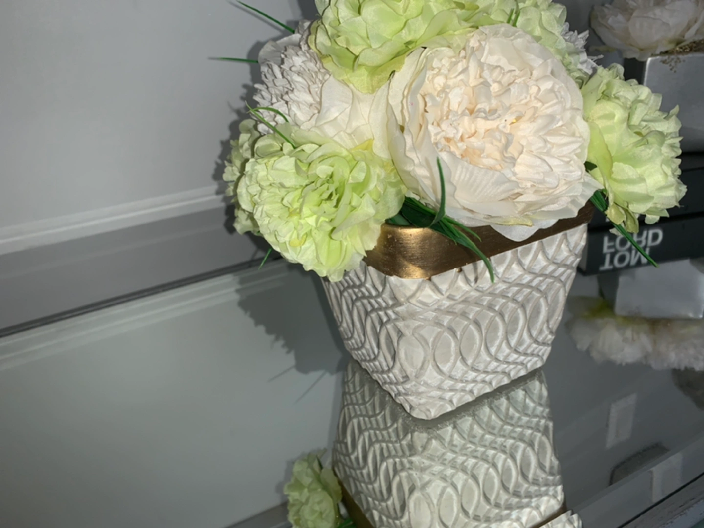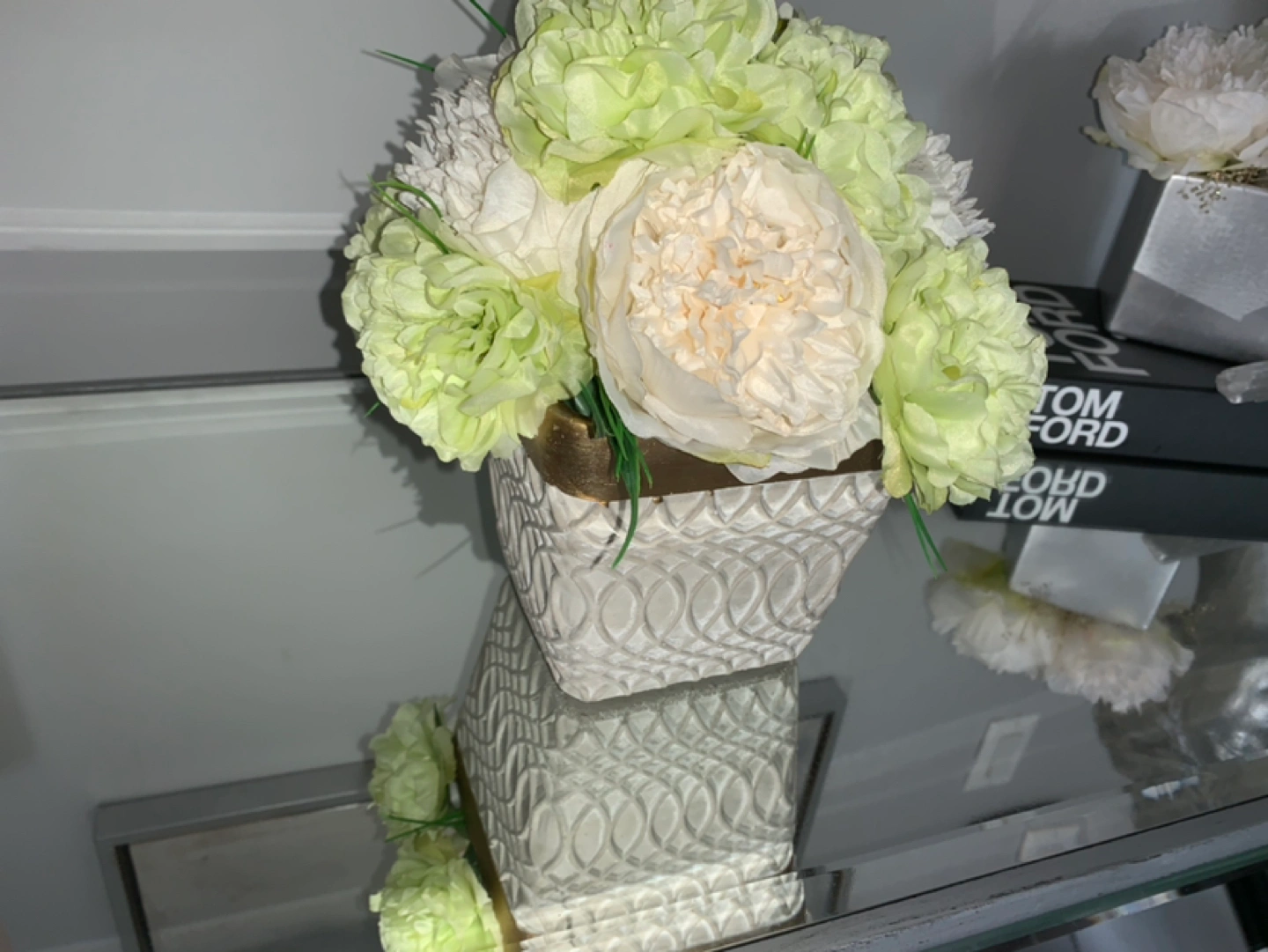 Beautiful gold trim indoor/outdoor flower vase with green and white hydrangeas and peonies. Can change the colors of the hydrangeas upon request. I have option of pink and white and purple and white, and green and white.