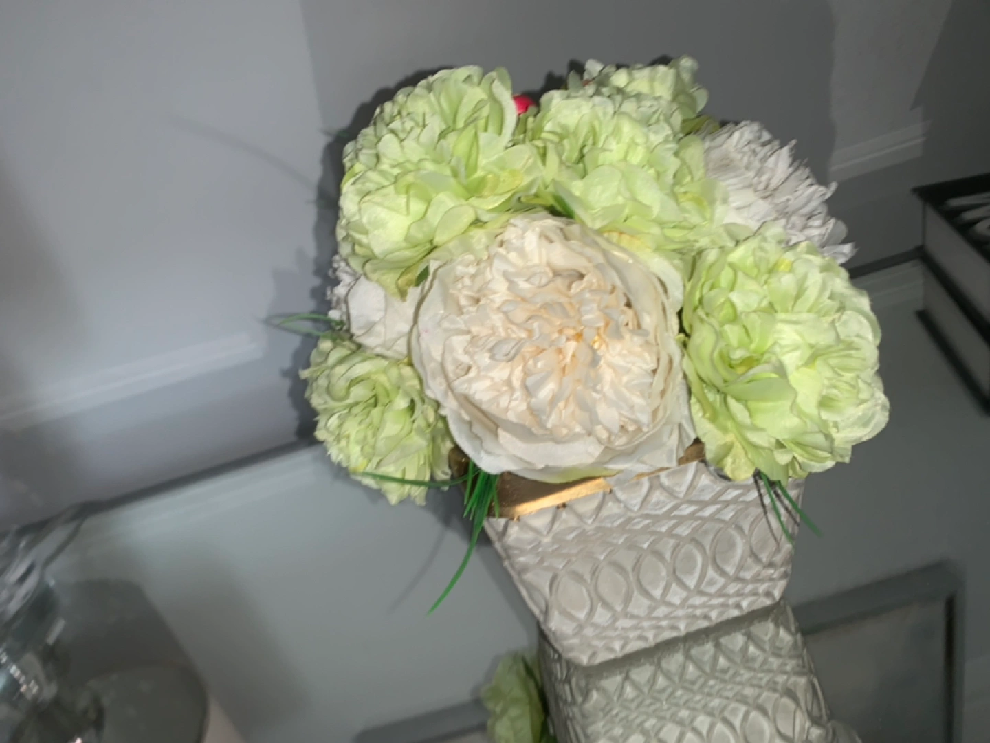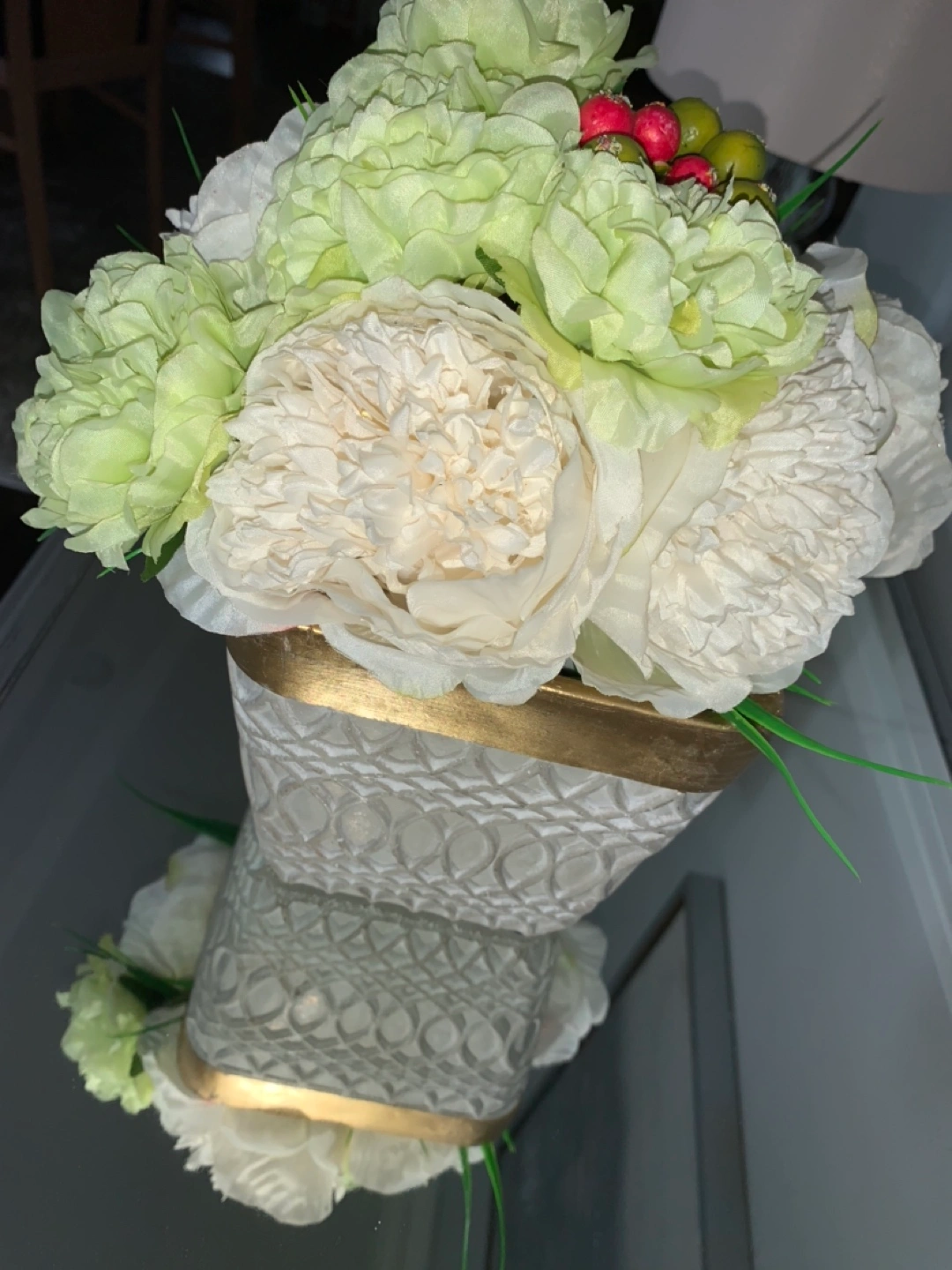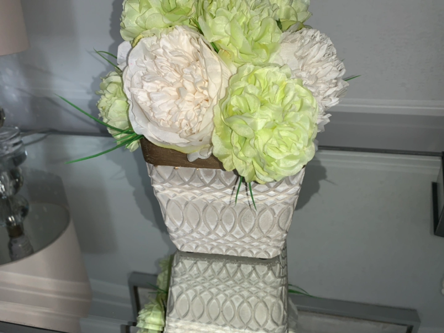 Beautiful gold trim indoor/outdoor flower vase with green and white hydrangeas and peonies. Can change the colors of the hydrangeas upon request. I have option of pink and white and purple and white, and green and white.