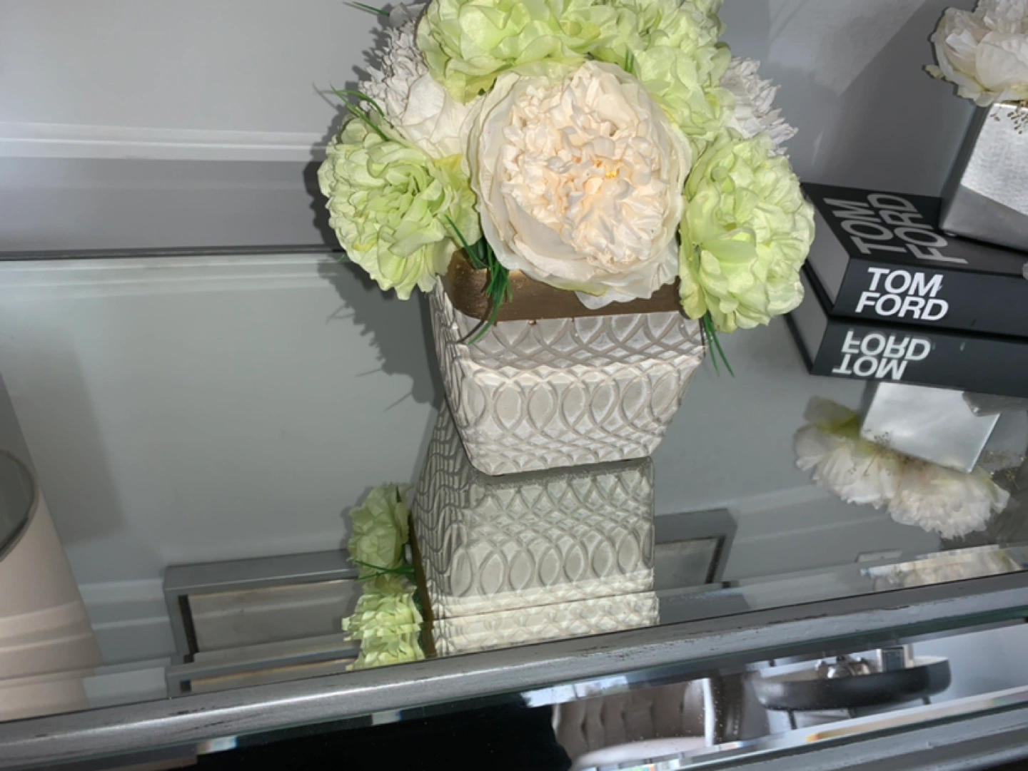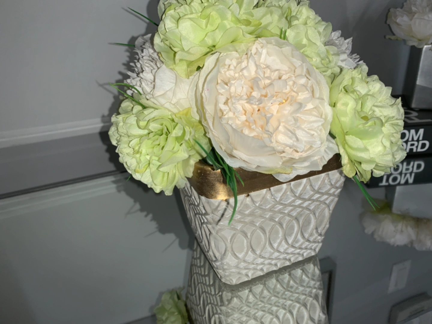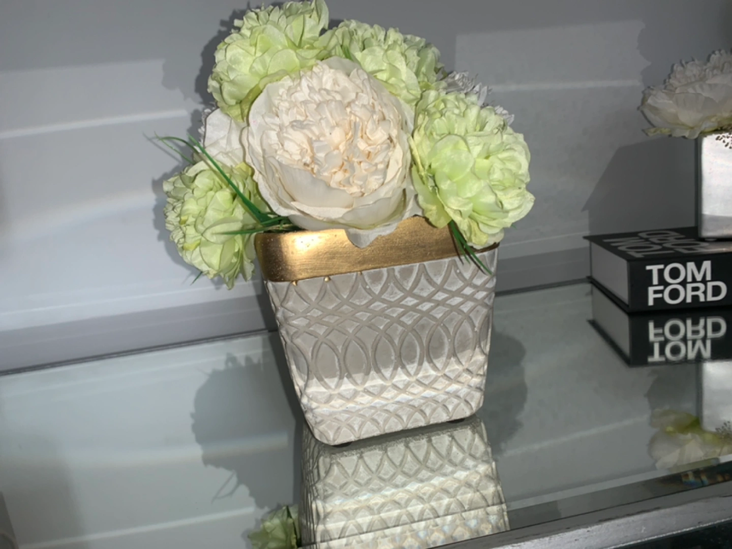 Beautiful gold trim indoor/outdoor flower vase with green and white hydrangeas and peonies. Can change the colors of the hydrangeas upon request. I have option of pink and white and purple and white, and green and white.
