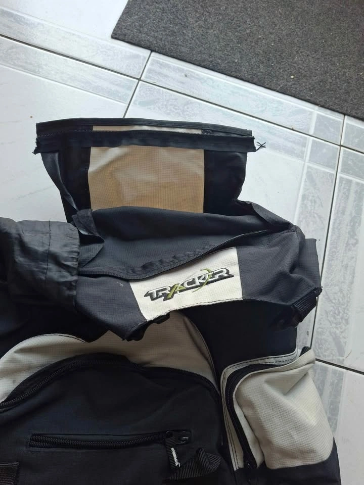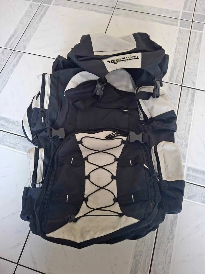 Large backpack for camping in the wilderness or hicking for days. Lots of straps and pouches. Some wear and the zipper is missing from the top pouch as shown in the last 2 photos but otherwise in good condition.