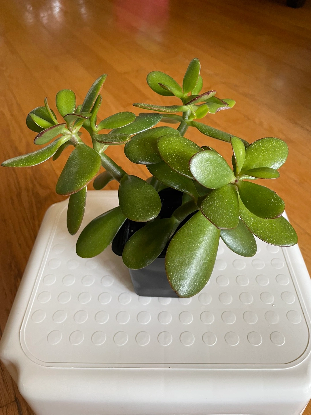 The jade plant is in a 6.5 cm x 6.5 cm x 8 cm nursery pot with tropical potting soil. It likes to get lots of bright, direct sunlight. Furthermore, water only when the soil is dry.
