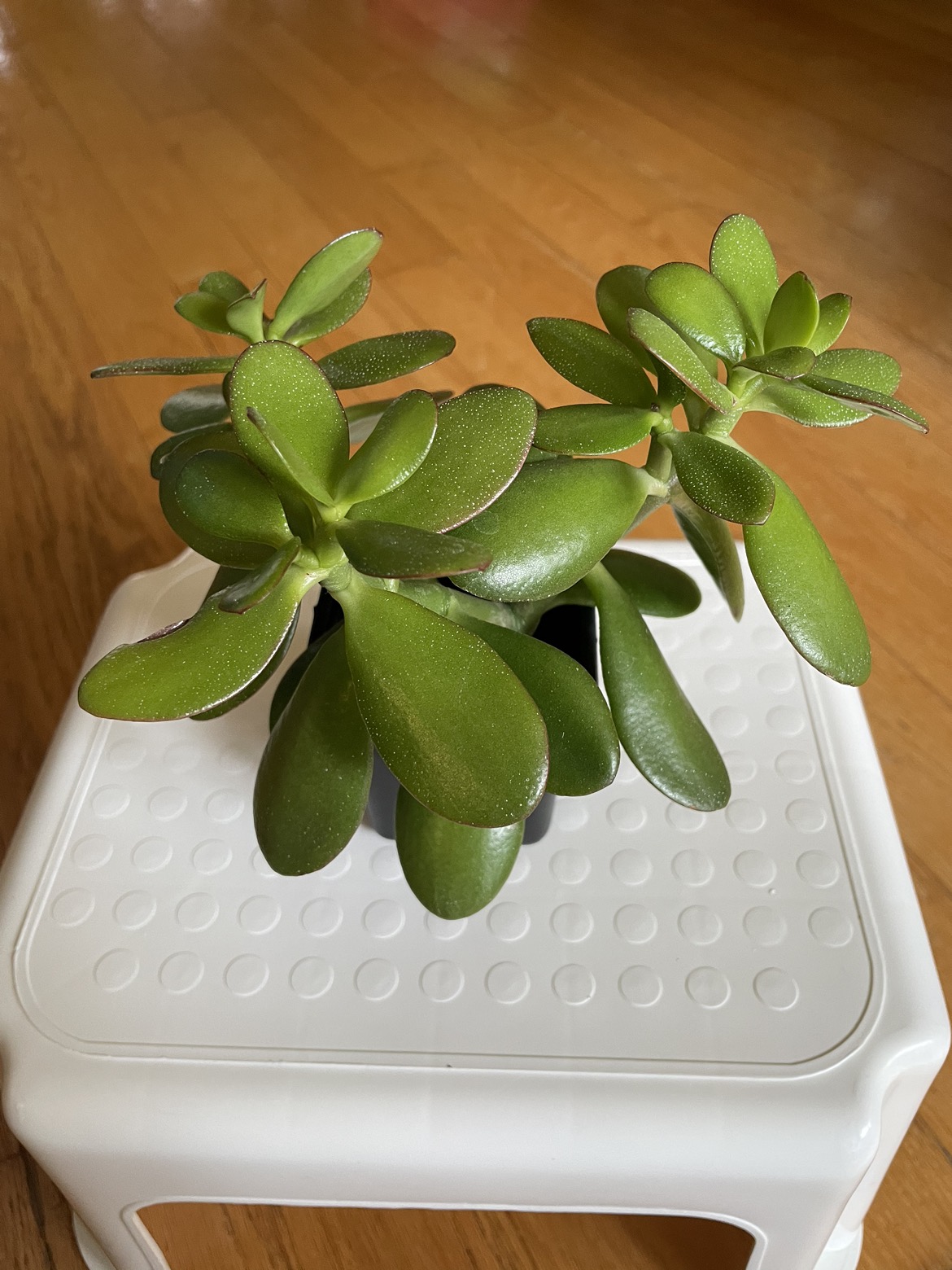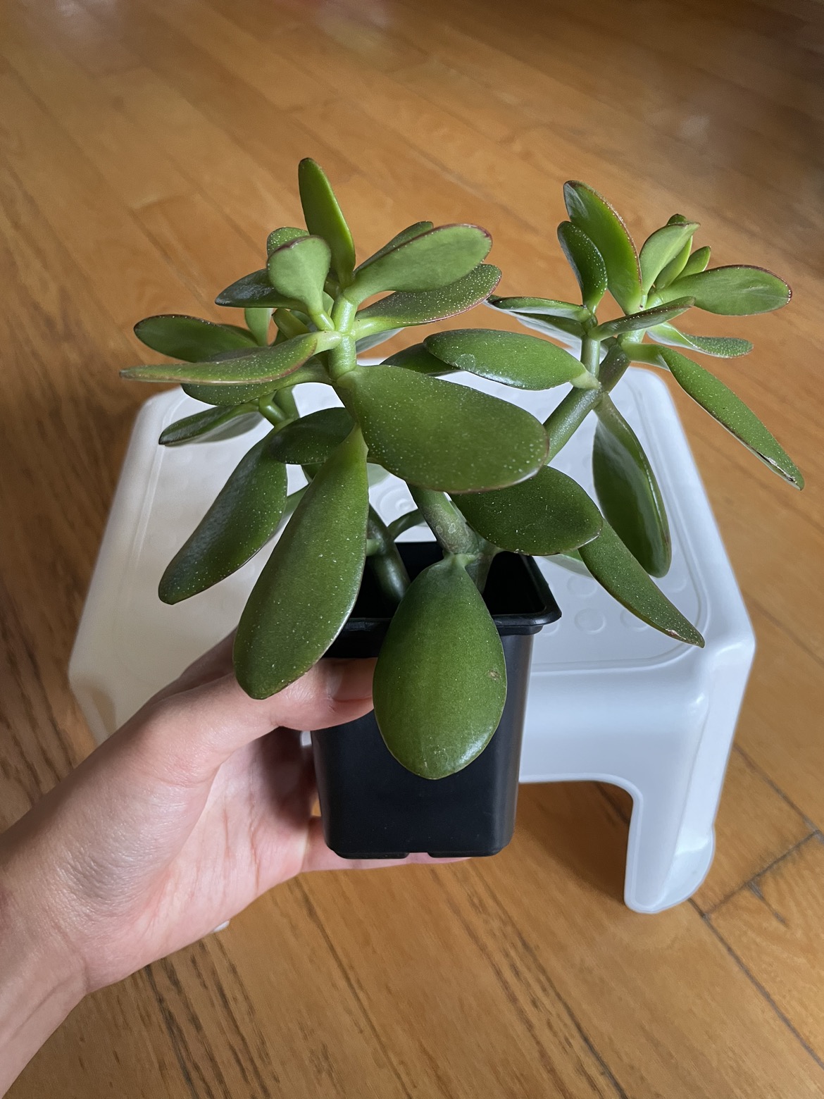 The jade plant is in a 6.5 cm x 6.5 cm x 8 cm nursery pot with tropical potting soil. It likes to get lots of bright, direct sunlight. Furthermore, water only when the soil is dry.