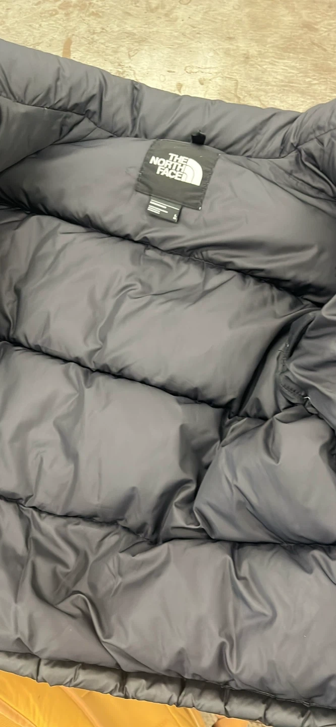 A warm puffer jacket from The North Face in black. It's a great option for staying cozy on colder days. Size is marked as medium.
