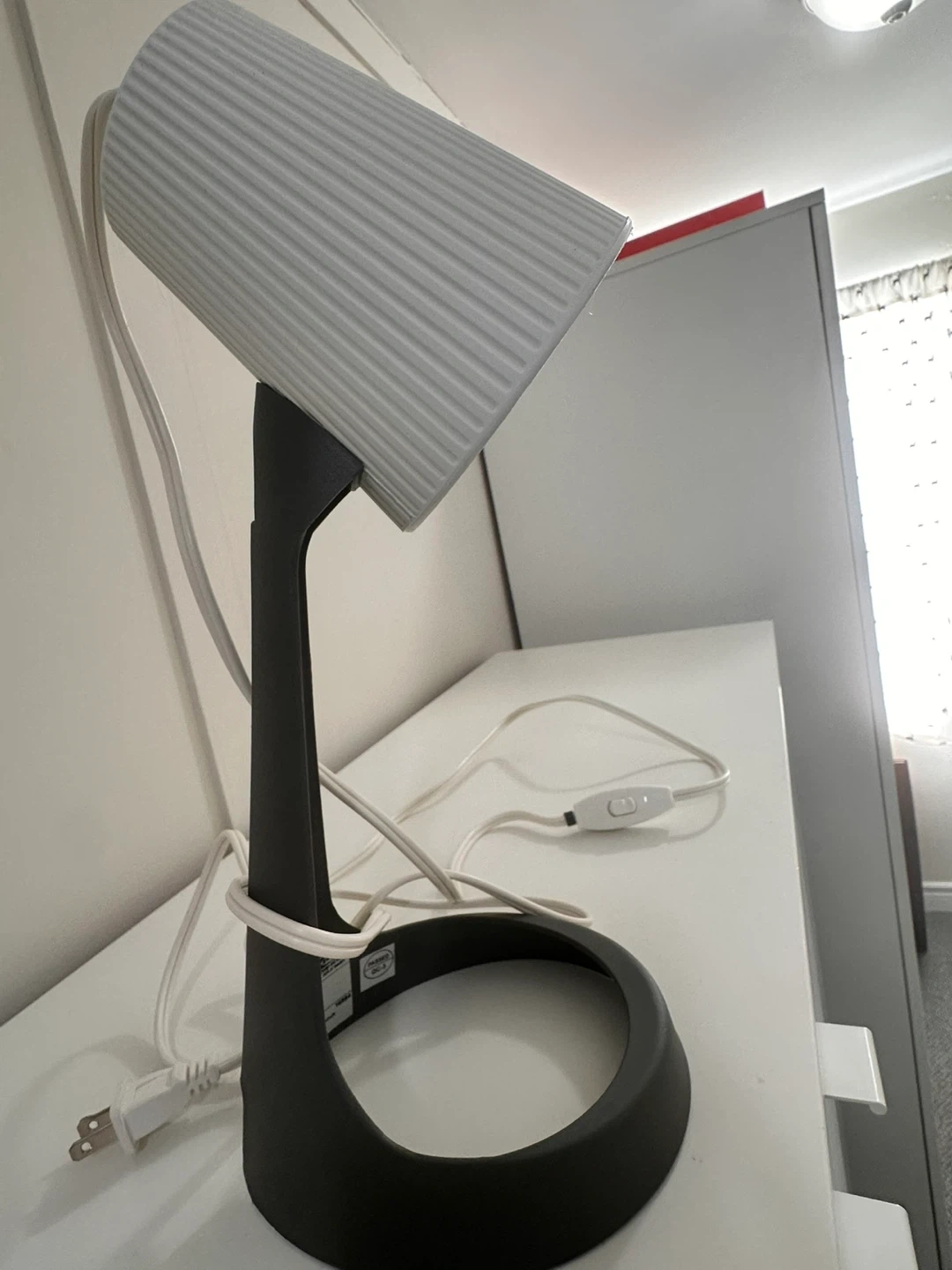 This is an IKEA SYVALLET table lamp. It has a dark grey base and a white, ribbed shade. The lamp is designed to use a max 8.6W LED type A lamp.