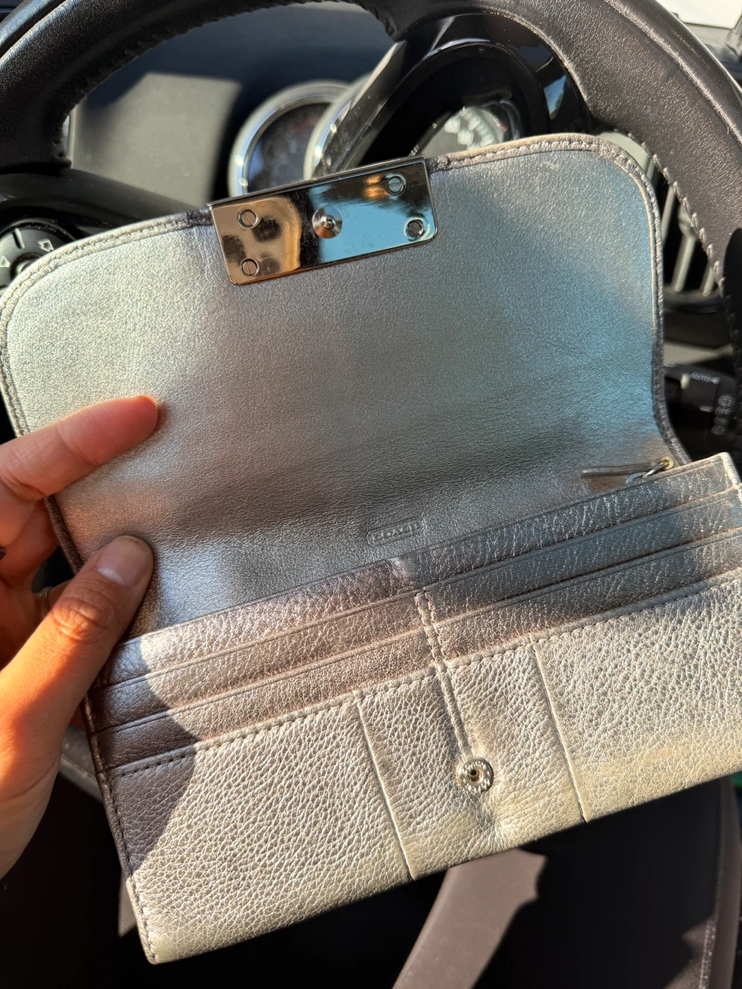 This is a pre-owned Coach wallet with a silver leather exterior. It features multiple card slots and a zippered compartment for coins. It's a stylish accessory for everyday use.