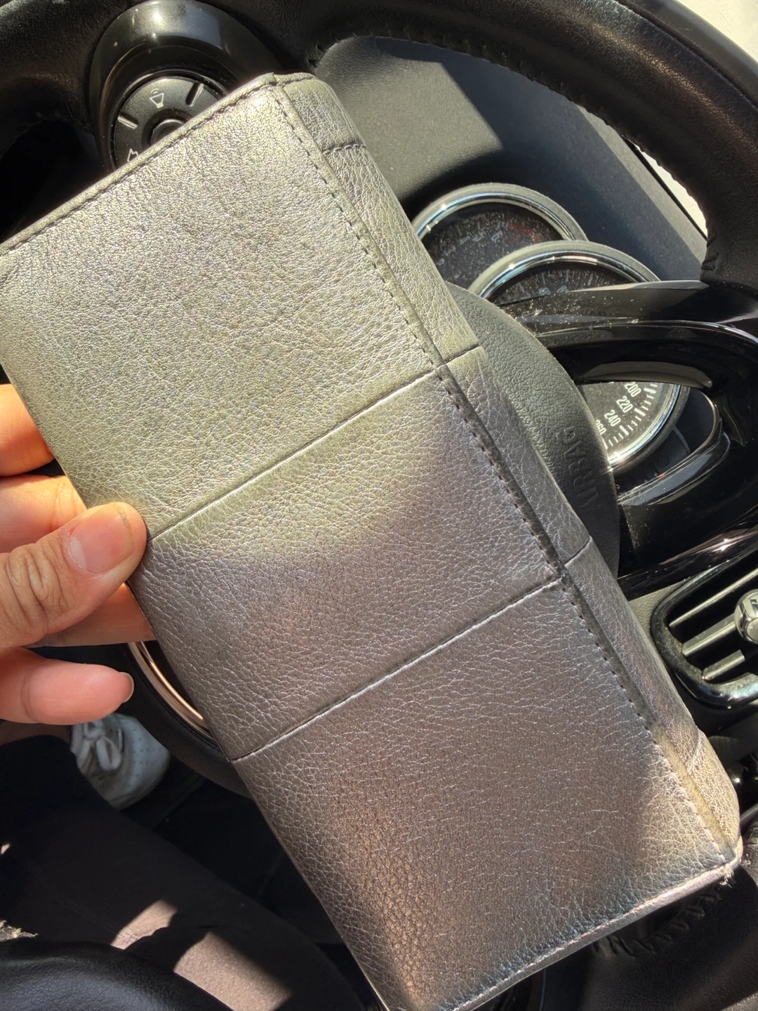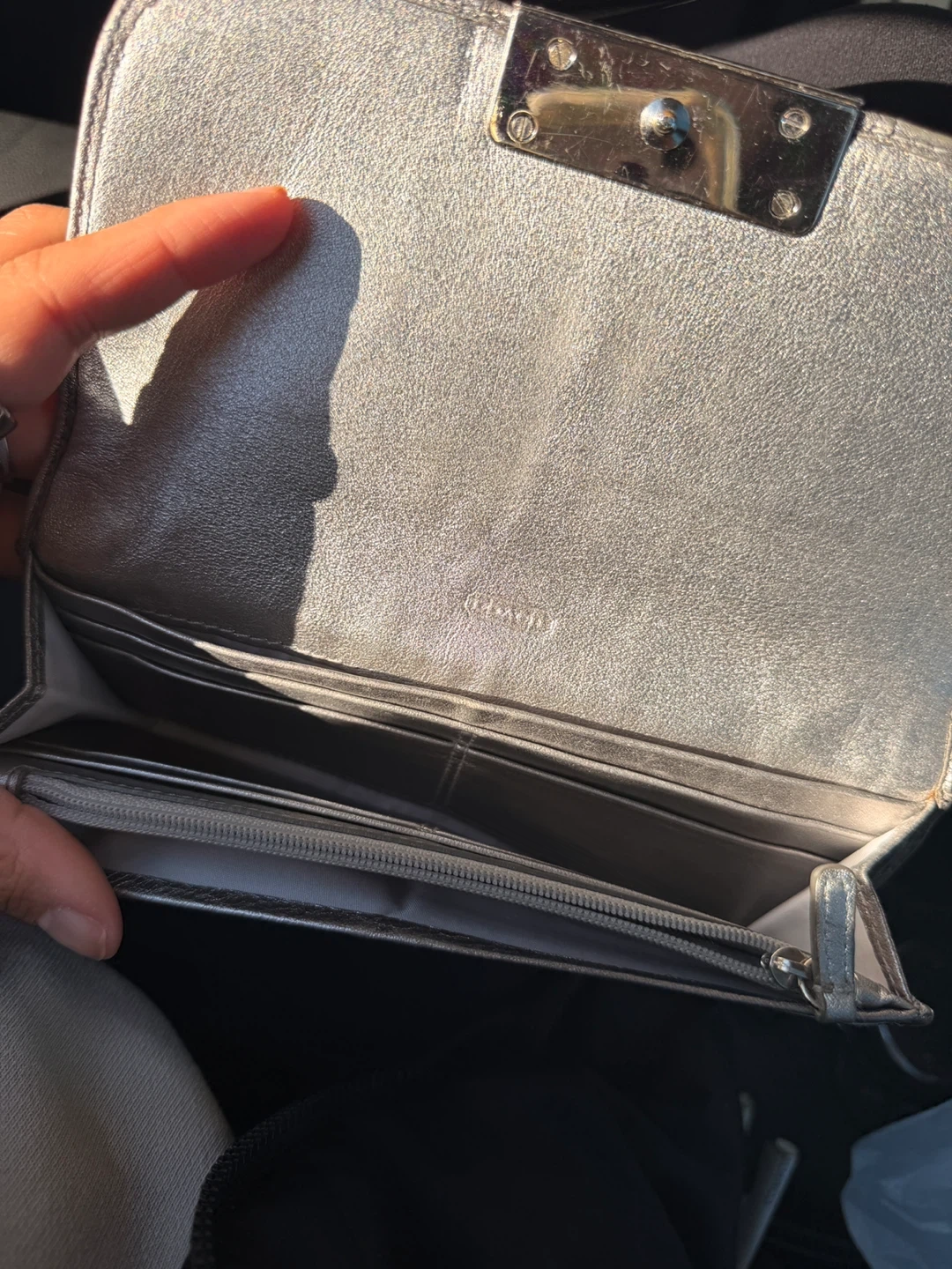 This is a pre-owned Coach wallet with a silver leather exterior. It features multiple card slots and a zippered compartment for coins. It's a stylish accessory for everyday use.
