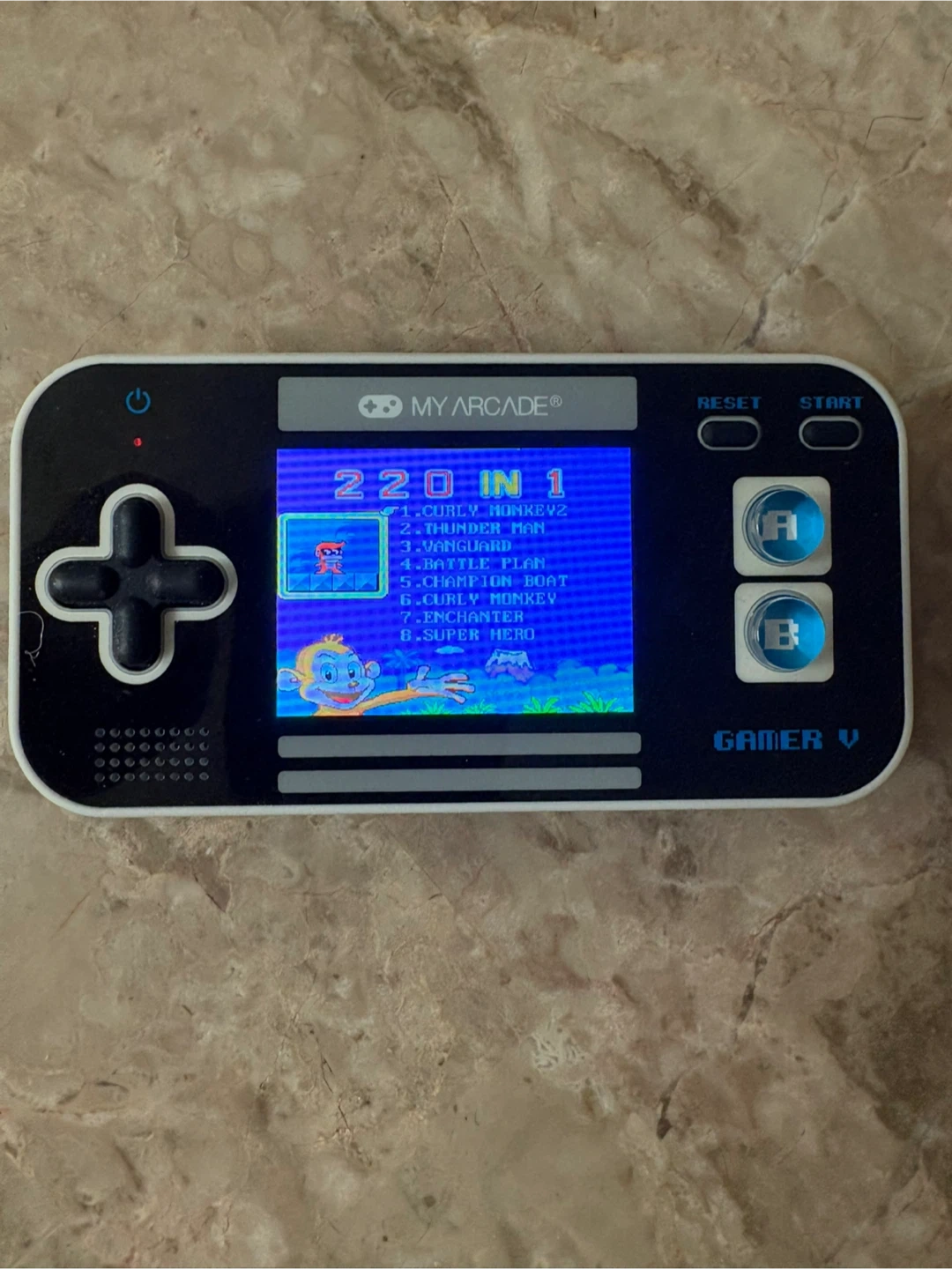 This is a My Arcade Gamer V handheld console with 220 games built-in. It features a D-pad, A and B buttons, reset, and start buttons. The screen displays a list of games including Curly Monkey and Thunder Man.