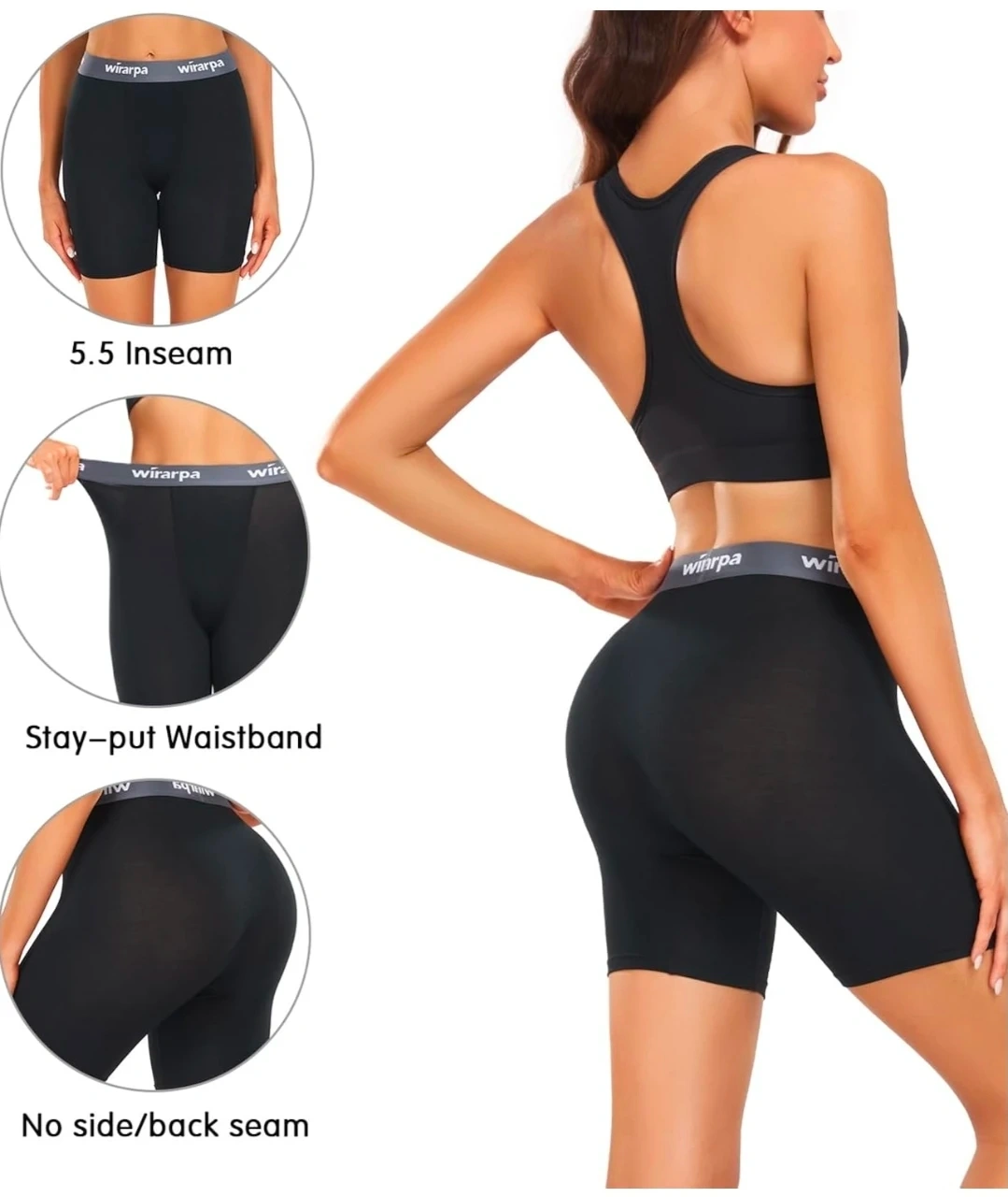 These wirarpa women's boxer shorts are made from micro modal fabric. They feature a 5.5" inseam and a double-layer crotch for comfort. The stay-put waistband ensures they remain in place throughout the day. This pack includes four pairs in black and grey.
