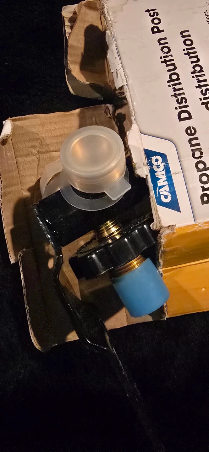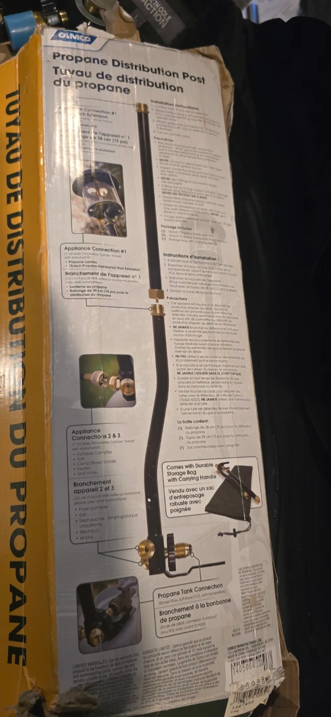 This Camco propane distribution post lets you connect up to 3 appliances to a single propane tank. It's 15-inch tall Great for camping, tailgating, or backyard BBQs! Brand New box is not good and no carry bag. Pu Surrey **$35**