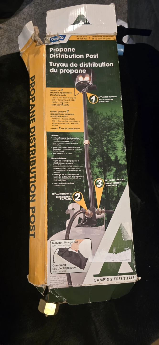 This Camco propane distribution post lets you connect up to 3 appliances to a single propane tank. It's 15-inch tall Great for camping, tailgating, or backyard BBQs! Brand New box is not good and no carry bag. Pu Surrey **$35**