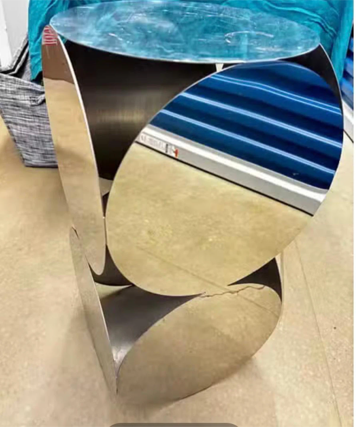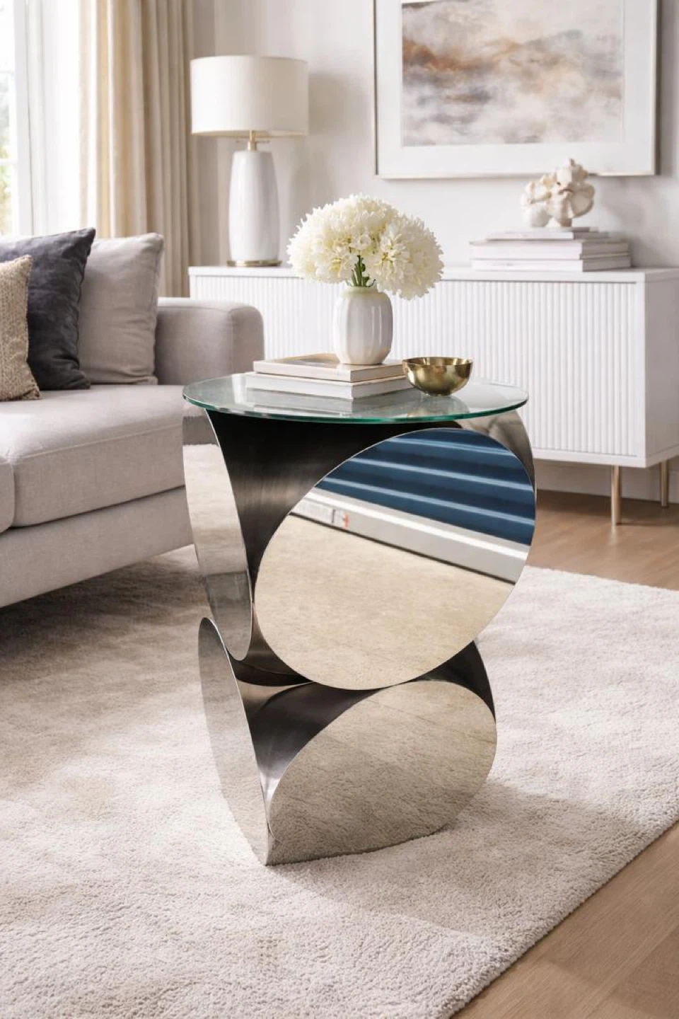 A striking accent table featuring a polished metal base with a unique curved design. It's topped with a clear glass surface. This piece adds a modern flair to any living space.
