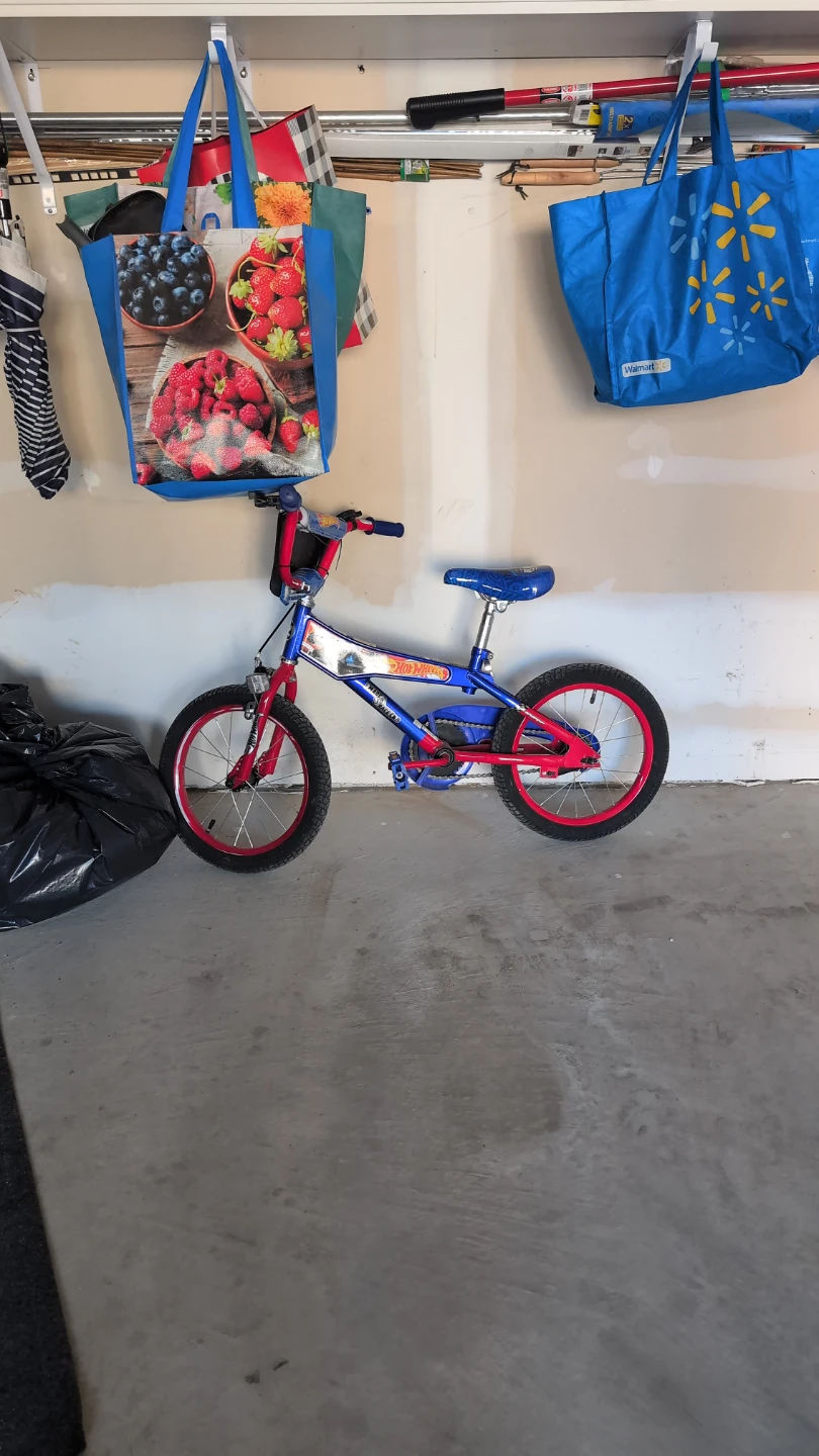 This is a Hot Wheels branded bicycle for kids. It's blue and red with a Hot Wheels theme. Great for young riders learning to pedal!