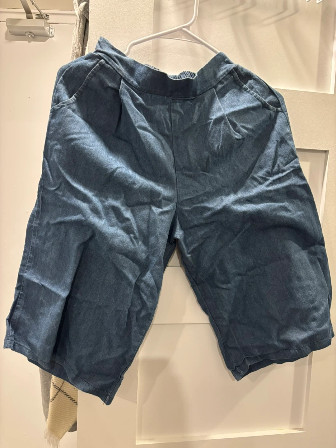 These culottes are a breezy blue denim. They feature an elastic waistband and two front pockets. The wide leg design offers a relaxed fit.