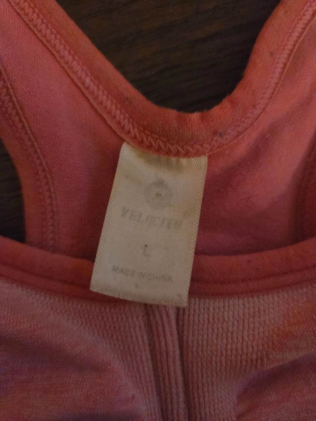 This is a pink sports bra by VELICITY. It's a size large with a racerback design. The material is a blend designed for comfort during workouts.