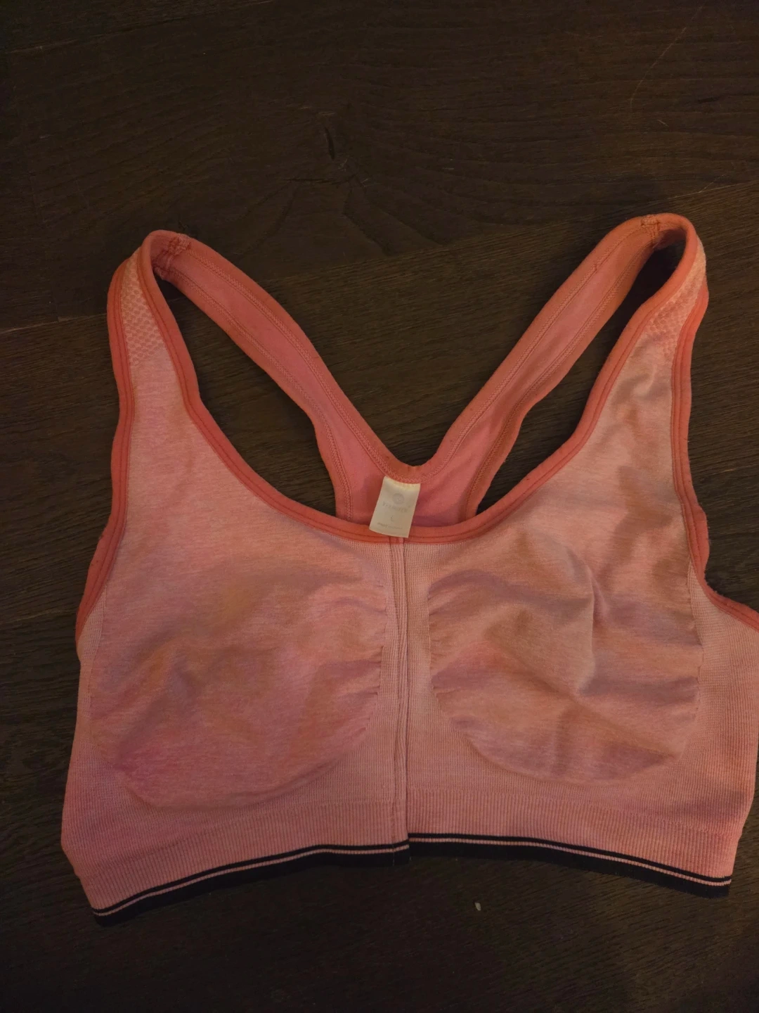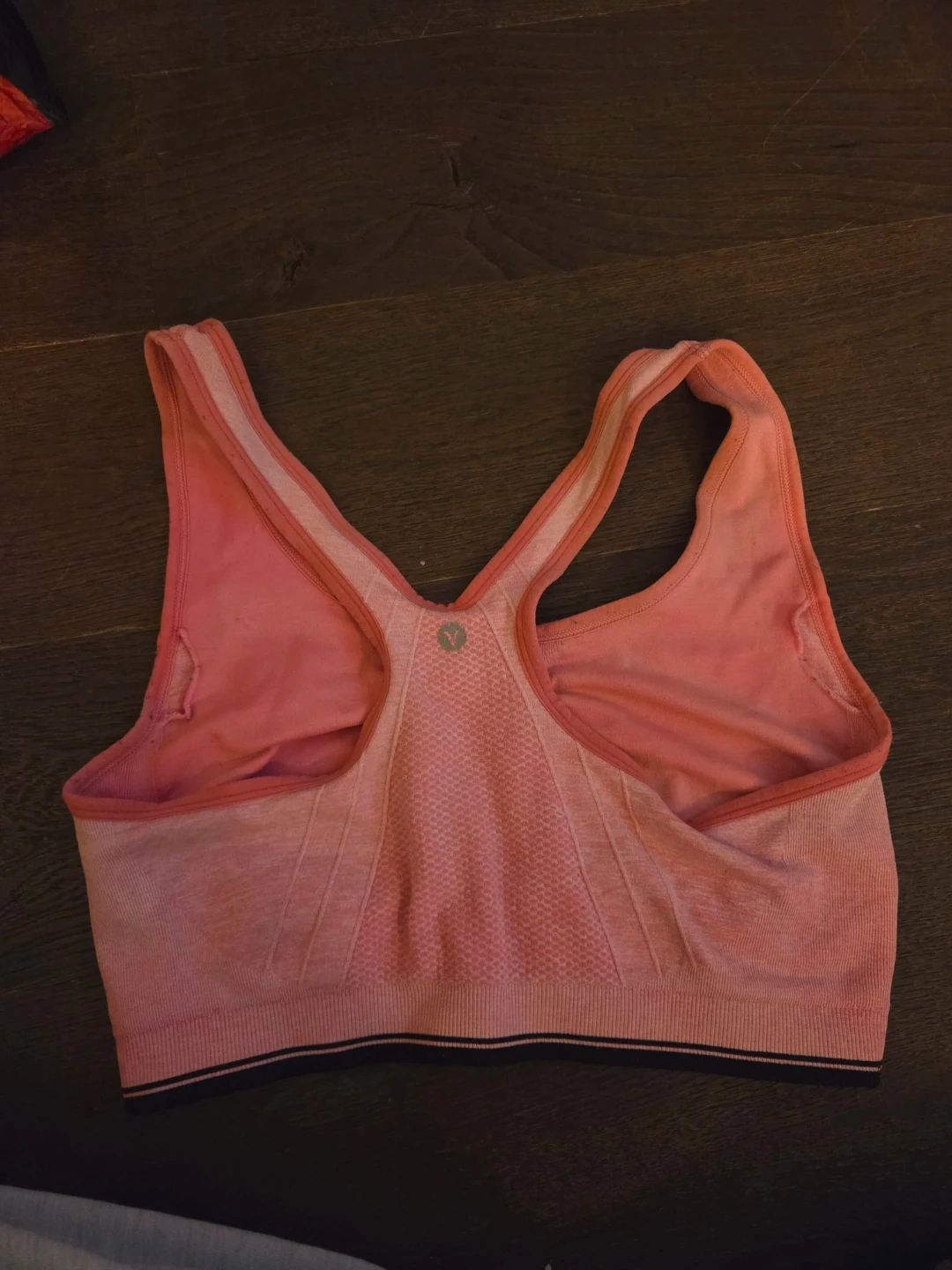 This is a pink sports bra by VELICITY. It's a size large with a racerback design. The material is a blend designed for comfort during workouts.
