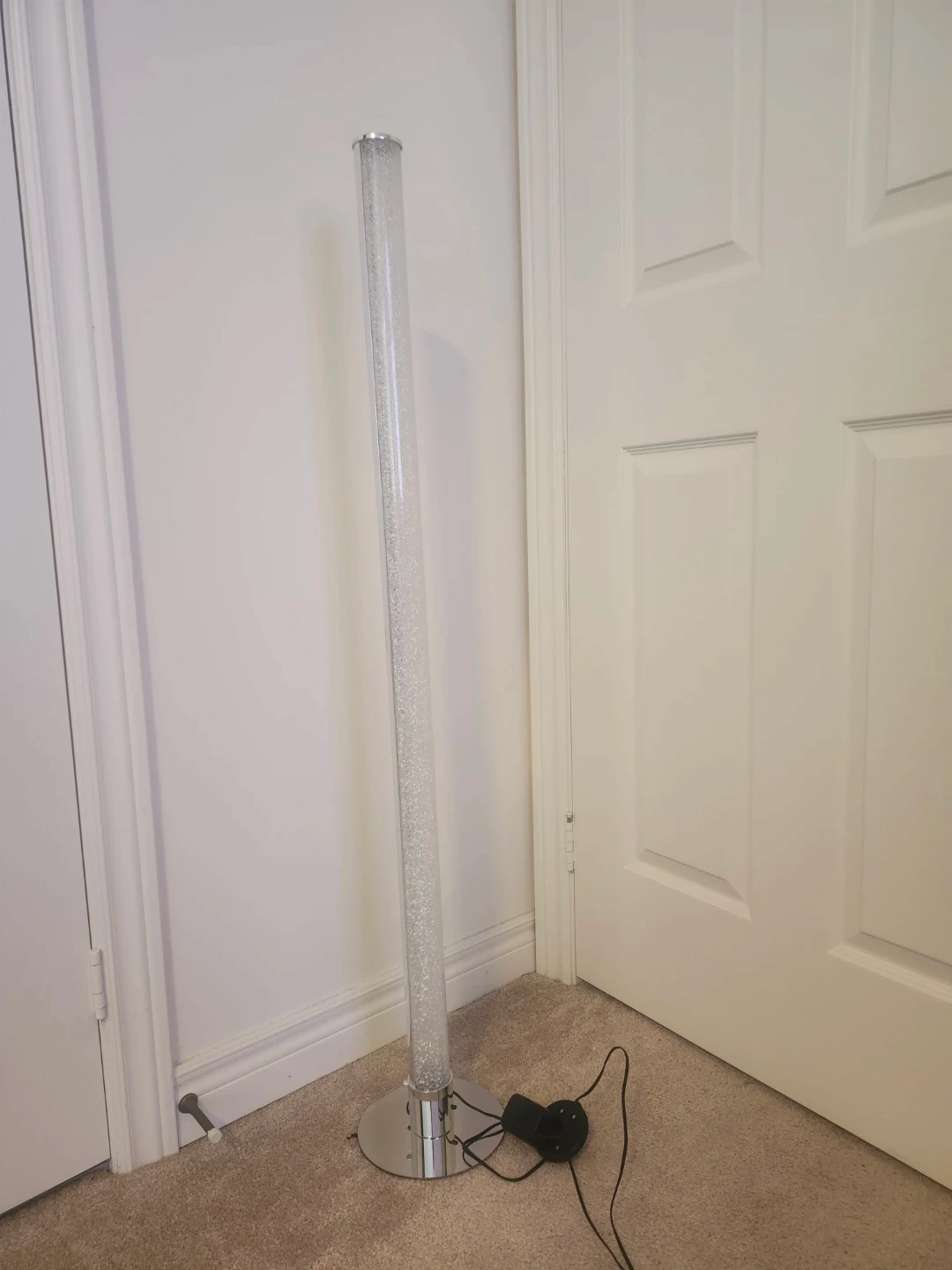 This is a bubble column floor lamp. It has a clear plastic tube filled with small bubbles and a chrome base. It's powered by a cord with an on/off switch. This lamp creates a unique visual effect.