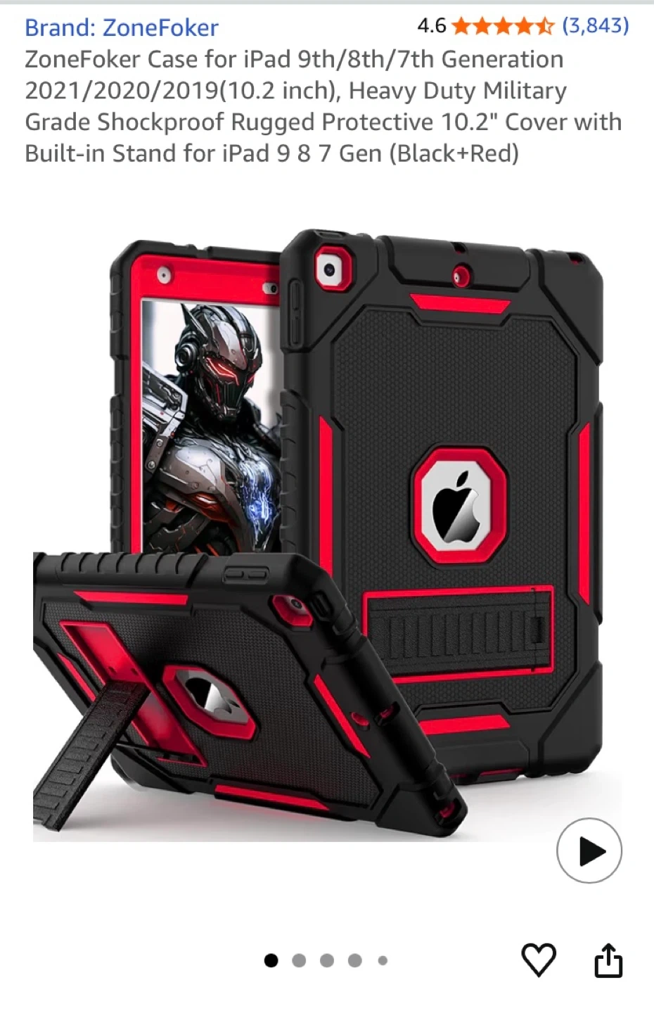 ZoneFoker case for iPad 9th/8th/7th Generation 2021/2020/2019 (10.2 inch) in black and red. It's a heavy duty military grade shockproof rugged protective cover with a built-in stand. Perfect for your iPad 9, 8, or 7 Gen!