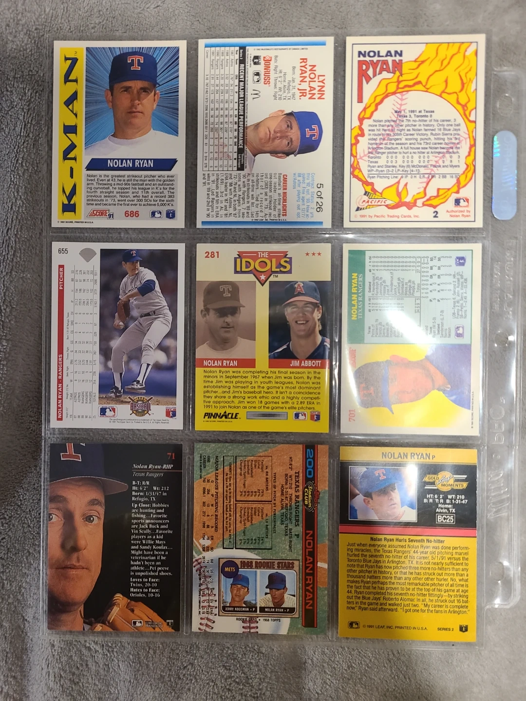 A collection of Nolan Ryan baseball cards. Includes various cards from different sets and years featuring the legendary pitcher. Some cards highlight his no-hitter achievements.