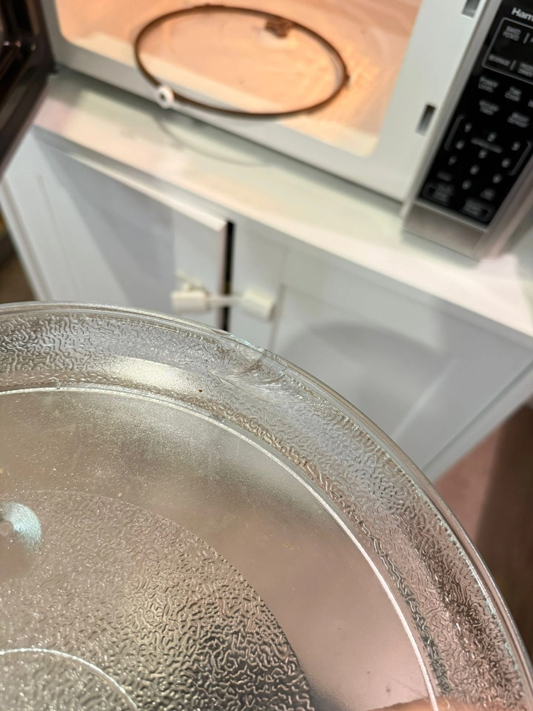 Hamilton Beach microwave. Stainless steel finish. Glass turntable included, shows some wear. Almost new