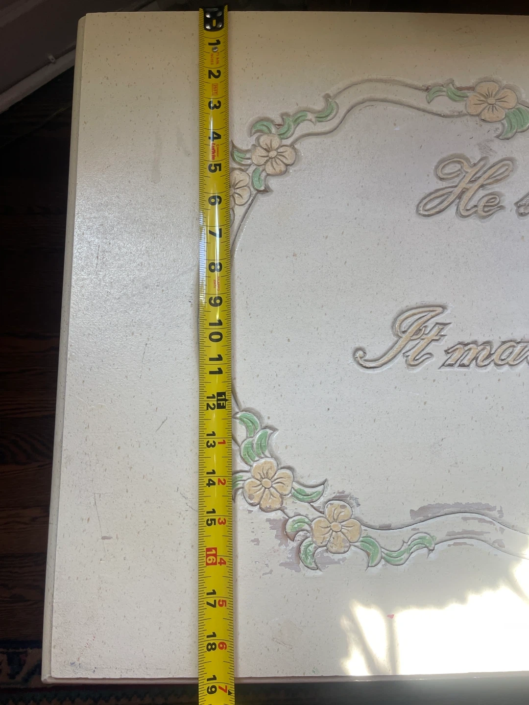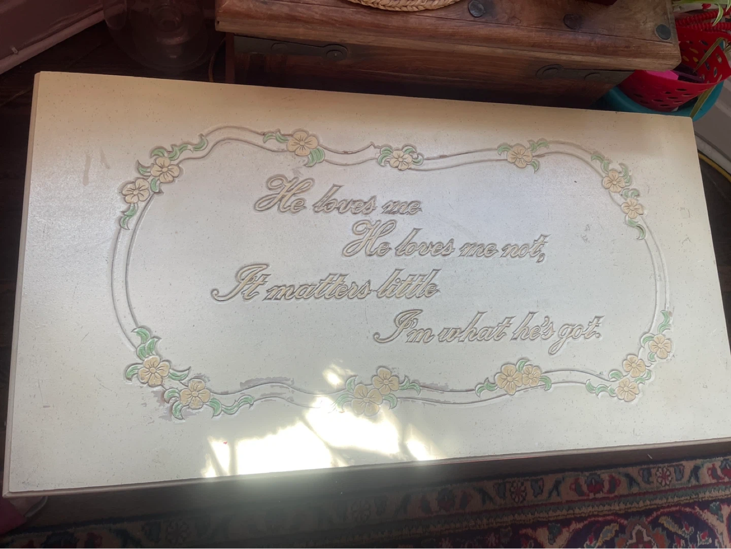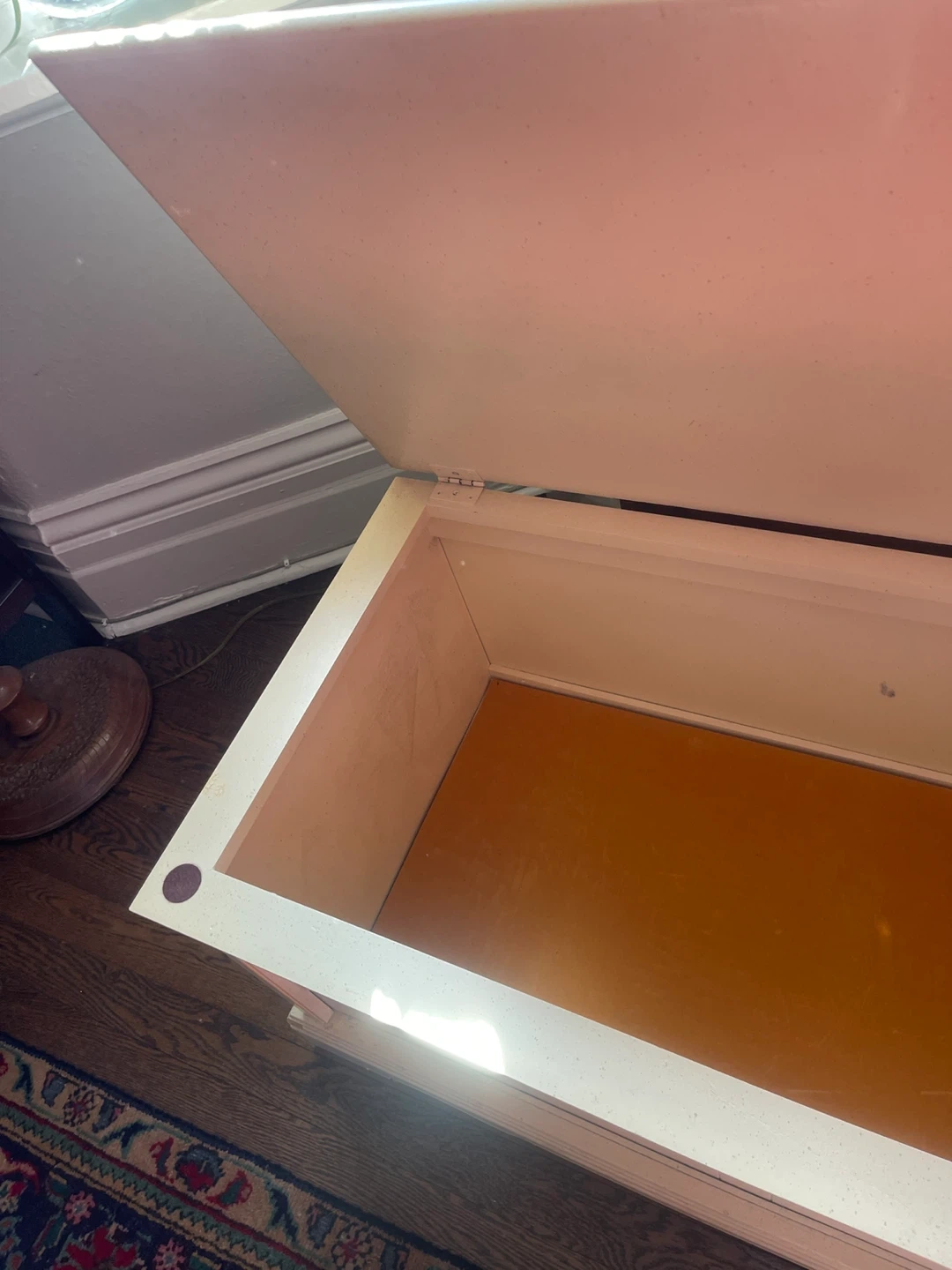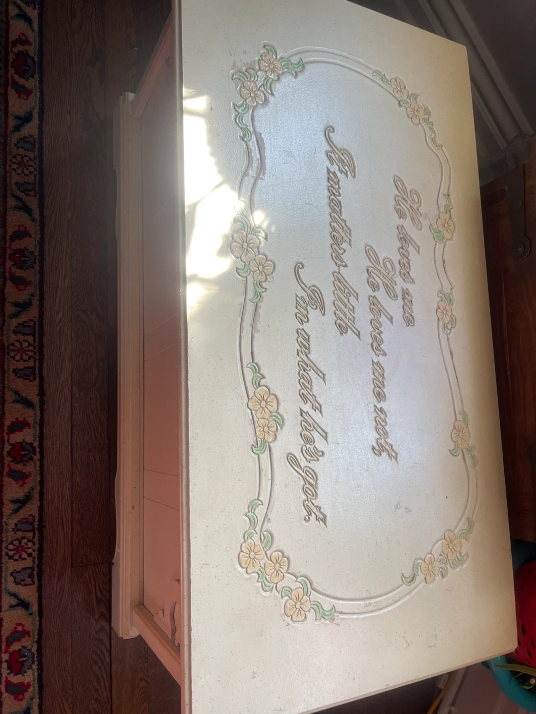 This charming storage chest is painted a soft cream with delicate floral accents and a sweet quote inscribed on the lid. It's perfect for stowing away blankets, toys, or other keepsakes. Very hewvy lid