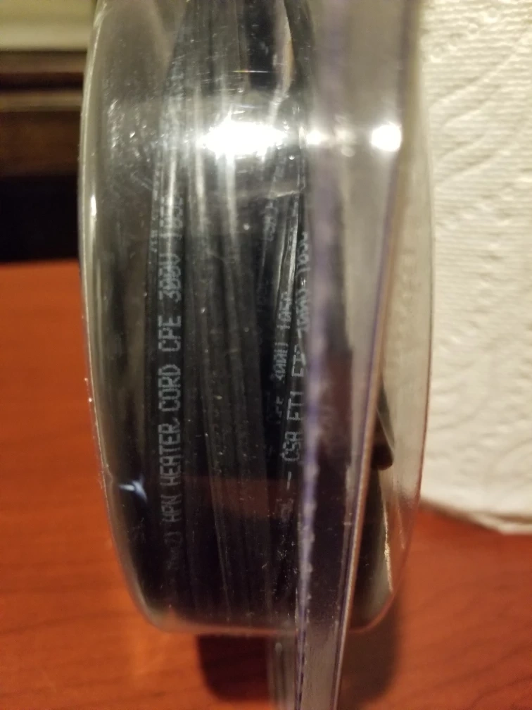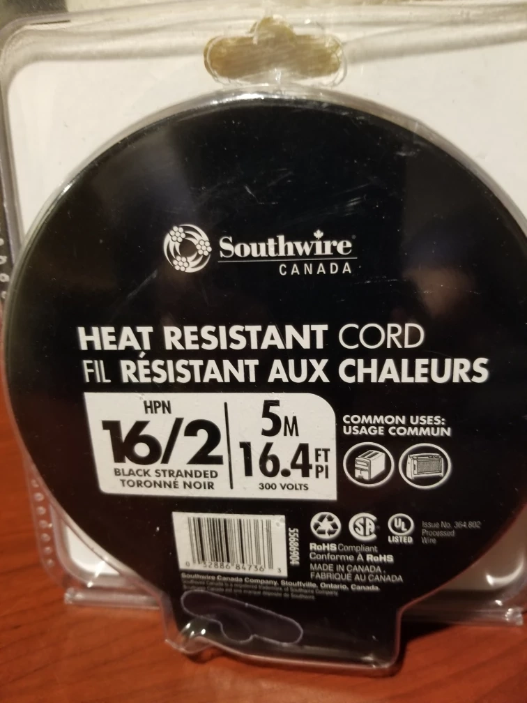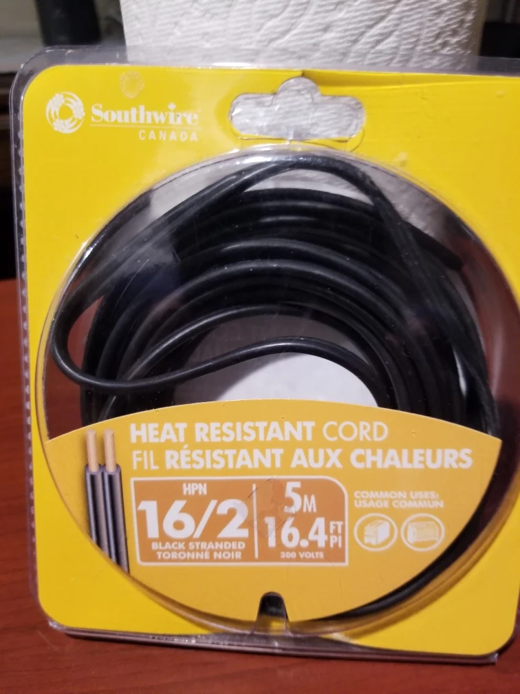 Selling a new package of Southwire heat resistant cord. It's 16/2 HPN black stranded wire, 5 meters (16.4 ft) long, and rated for 300 volts. Perfect for common usage applications around the house
