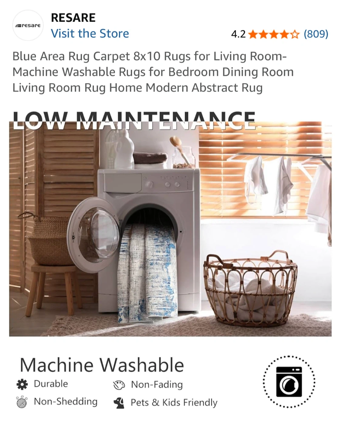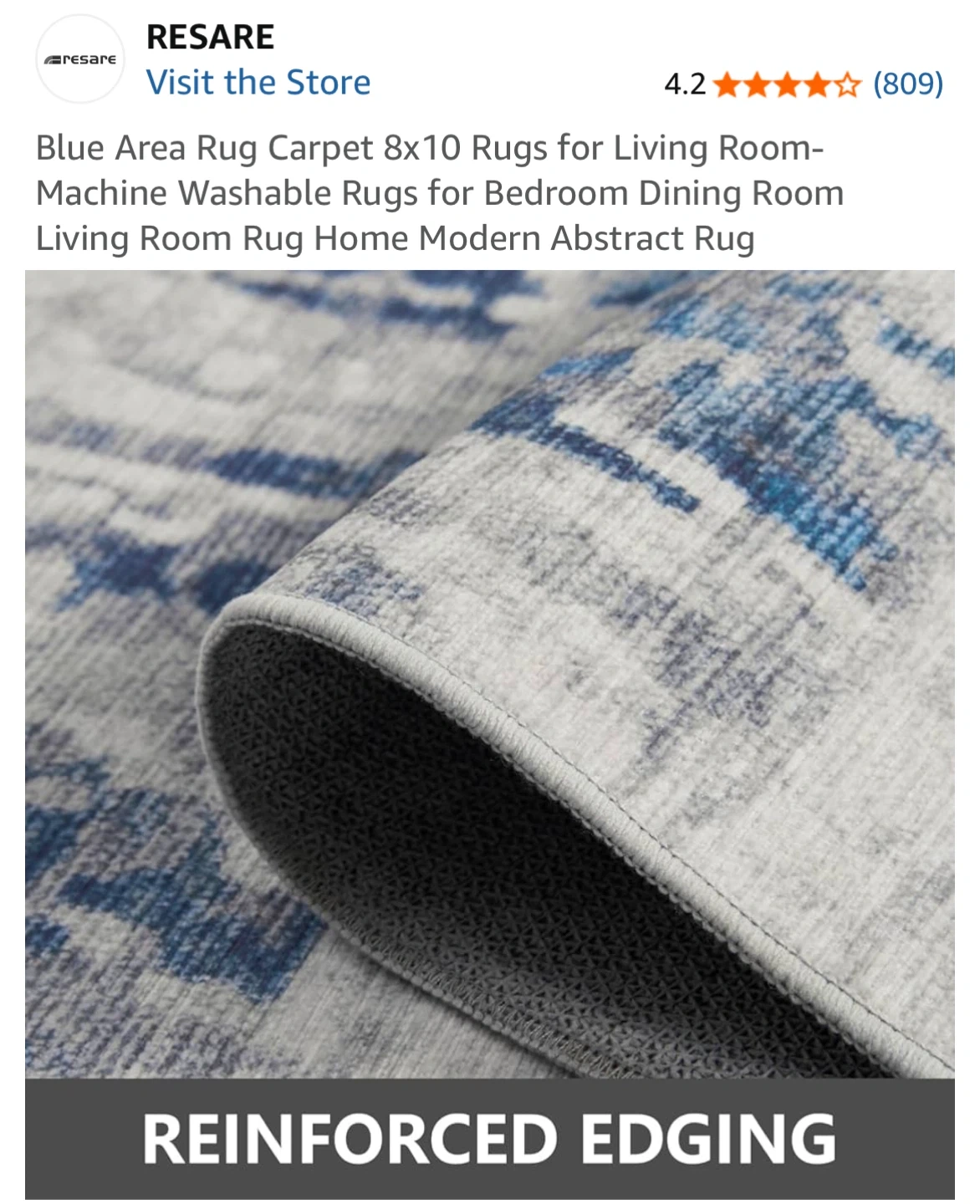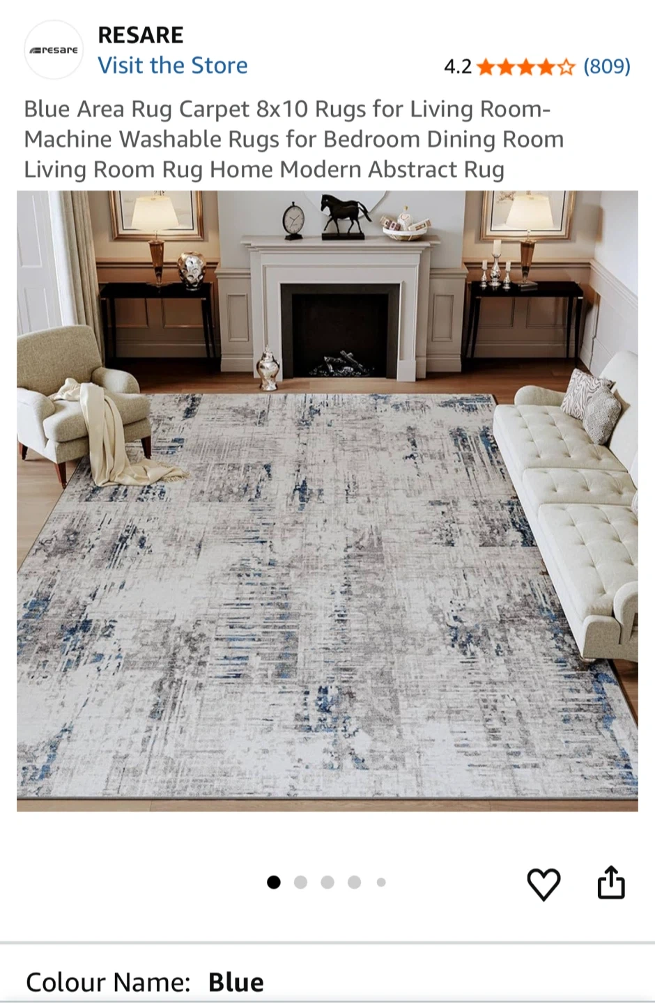 Selling a Resare blue area rug, sized 8x10. It's machine washable and perfect for the living room, bedroom, dining room, or any living space! The rug is durable, non-fading, and non-shedding. Plus, it's pet and kid-friendly!