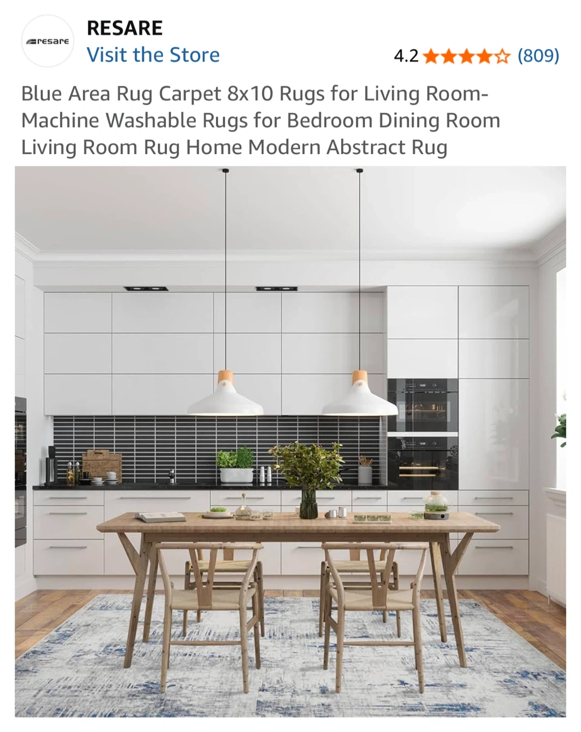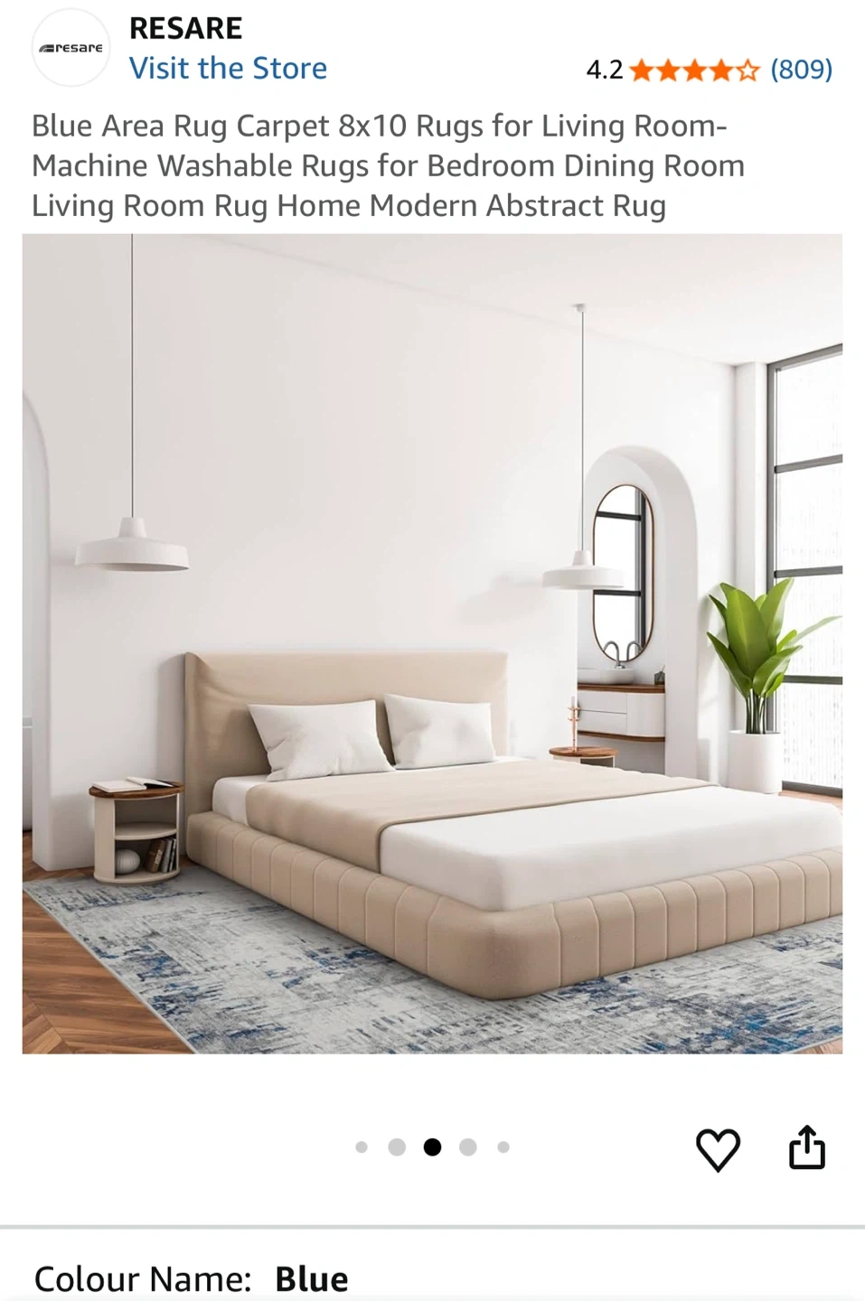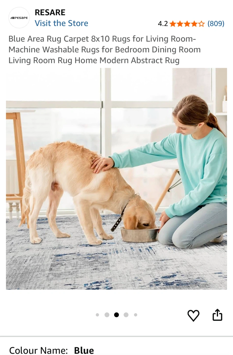 Selling a Resare blue area rug, sized 8x10. It's machine washable and perfect for the living room, bedroom, dining room, or any living space! The rug is durable, non-fading, and non-shedding. Plus, it's pet and kid-friendly!